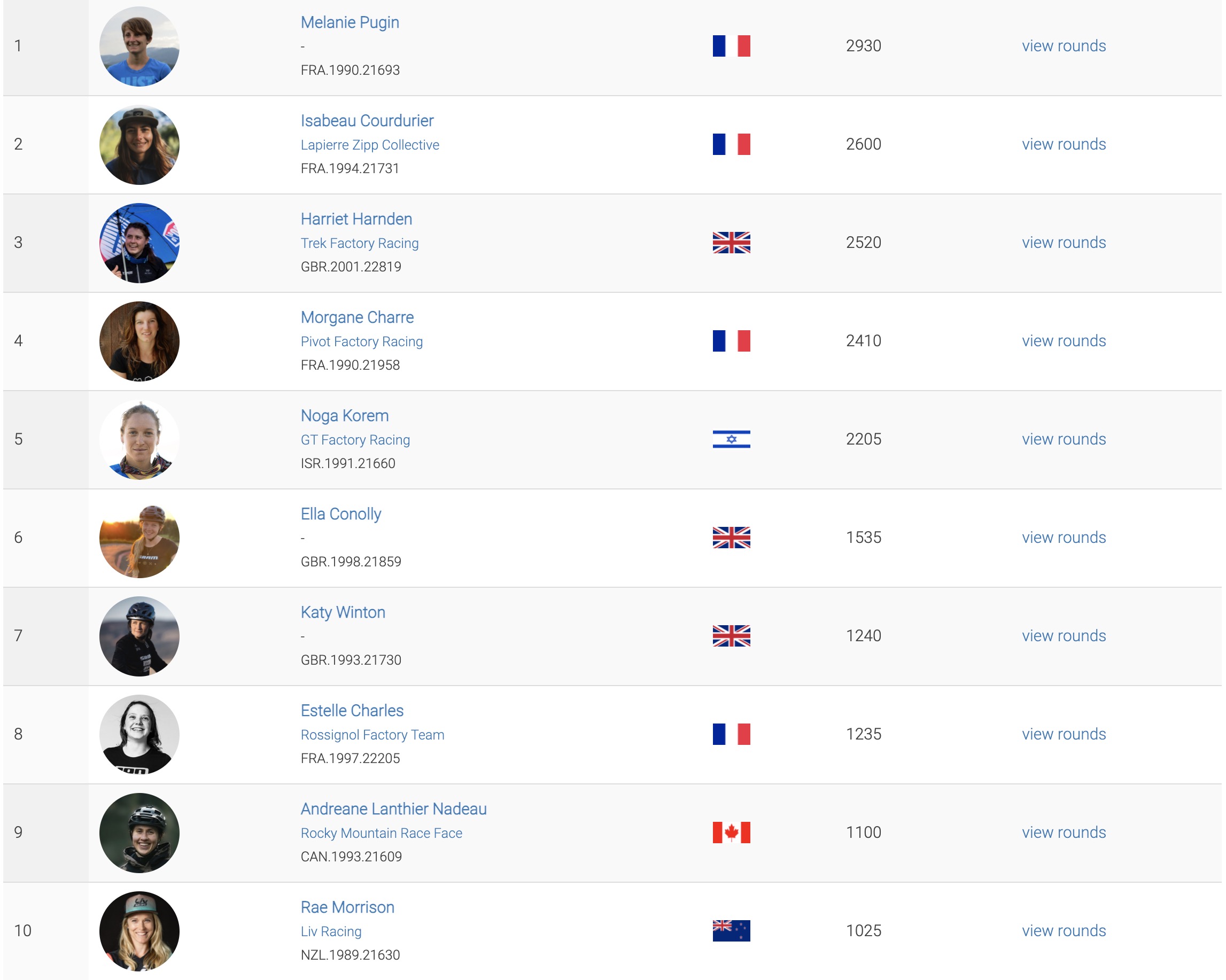 C’est le statu quo en tête du classement féminin où Mélanie Pugin reste aux commandes avec une belle avance de 330 points, contre 340 avant Loudenvielle. La française n’a pas gagné la semaine dernière, mais ses 2e et 3e places en course combinées à des 3e places sur les Queen Stages et une victoire dans la Pro Stage lui permettent de voir son avance diminuer d’à peine 10 points.