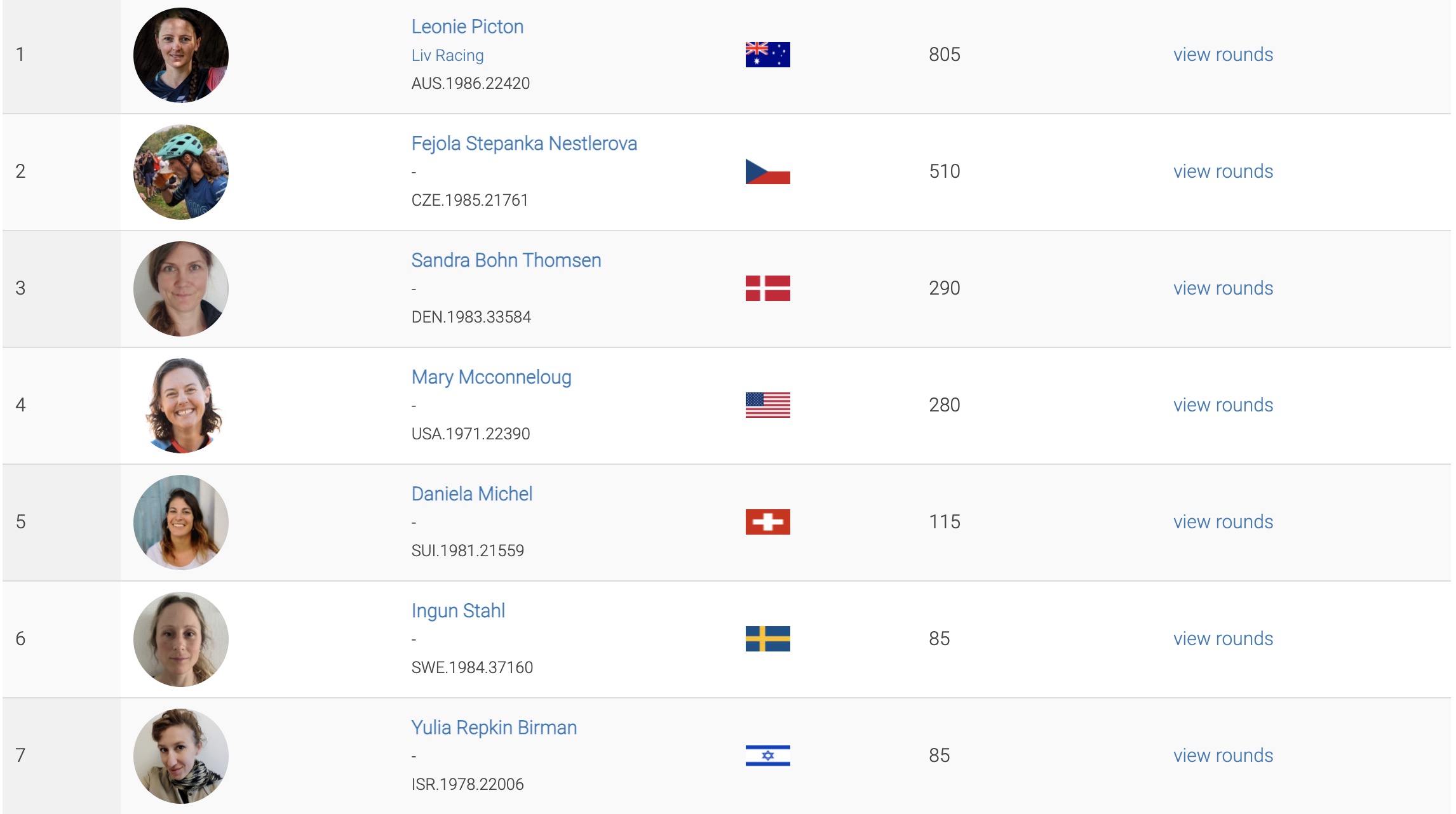 Domination tout aussi implacable chez les Femmes Masters 35+, où Leonie Picton est largement première du classement, avec quasi l’équivalent de deux victoires d’avance.