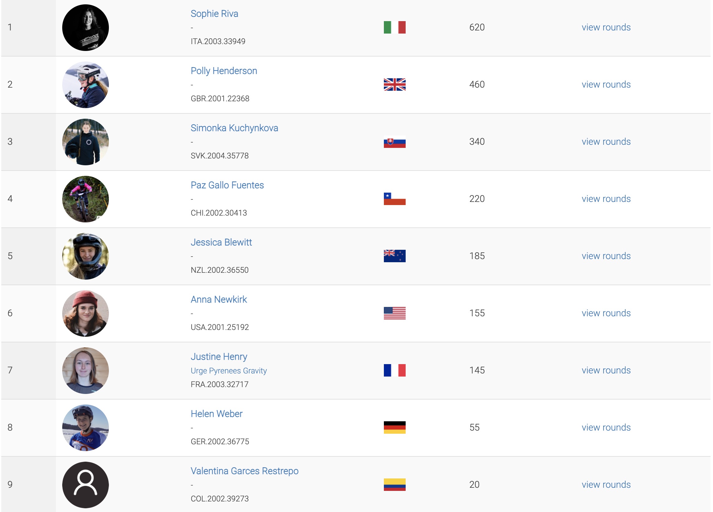 L’Italienne Sophie Riva est confortablement installée tout en haut du classement féminin des U21, devant Polly Henderson et Simonka Kuchynkova.