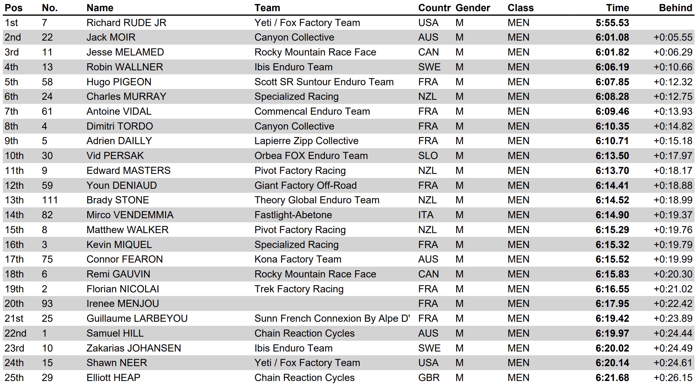Eh bien… chez les Hommes, pas vraiment, même s’il y a déjà des écarts conséquents ! Ce sont en tout cas exactement les mêmes trois pilotes qui composaient le podium de mercredi que l’on retrouve finalement aux avant-postes : Richie Rude, sur une autre planète, signe le scratch en étant… 5 secondes et demie plus rapide que tout le monde ! Derrière, Jack Moir prend la 2e place alors que Jesse Melamed termine 3e. Ce sont Robin wallner et Hugo Pigeon qui complètent le top 5 et empochent donc les autres points qu’il y avait en jeu sur cette Pro Stage.