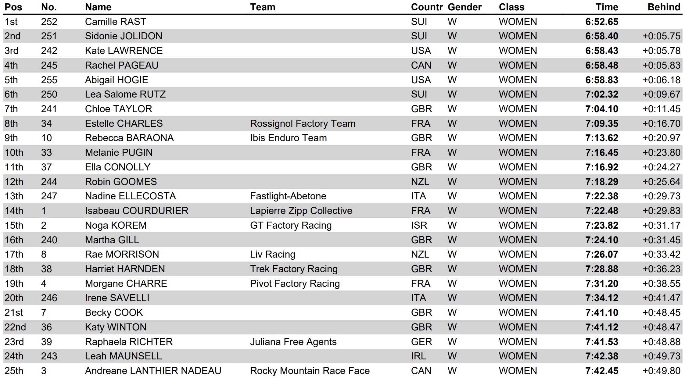 Chez les Dames par contre, les conditions difficiles et changeantes ont fortement rebattu les cartes. Les pilotes qui sont parties avant la pluie ont bénéficié d’un net avantage, et c’est Camille Rast, skieuse pro, qui a sur le mieux en profiter en signant tout simplement le scratch ! Elle s’impose devant d’autres relatives « inconnues » : Sidonie Jolidon (2e), Kate Lawrence (3e), Rachel Pageau (4e) et Abigail Hogie (5e).