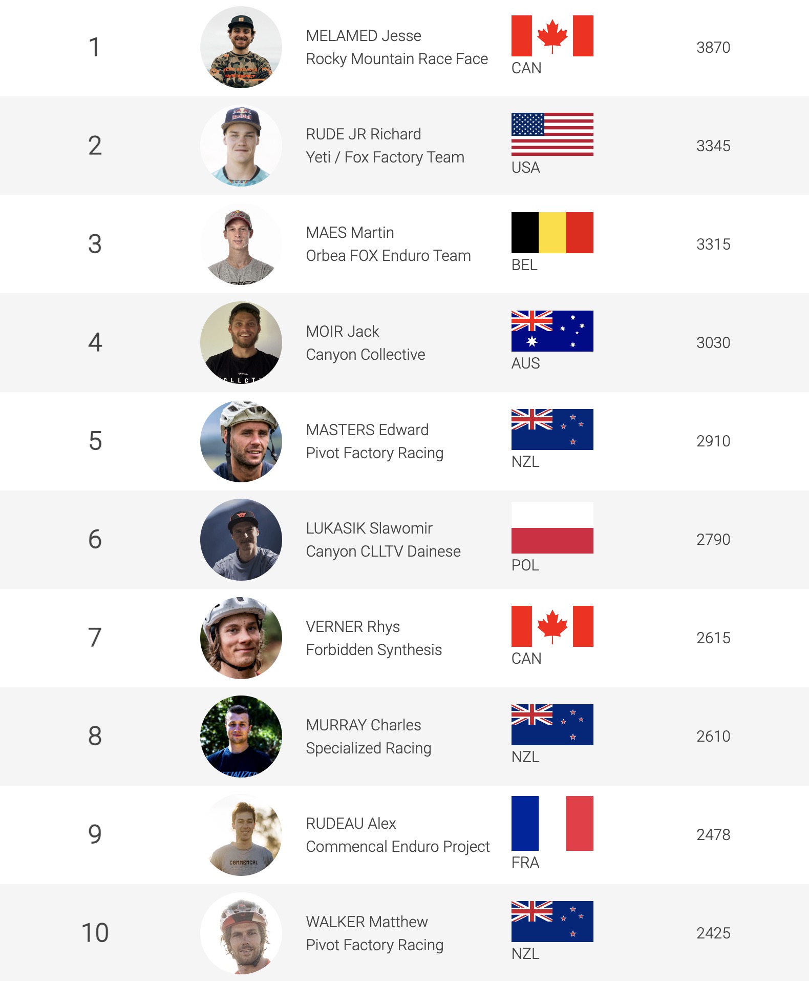 12e avant la manche finale, Alex Rudeau profite de sa superbe victoire à Loudenvielle devant Martin Maes et Jack Moir pour gagner trois places et terminer la saison à la 9e position du général. C’est également le premier Français de ce classement. Derrière lui, le Néo-zélandais Matt Malker ferme le top 10.