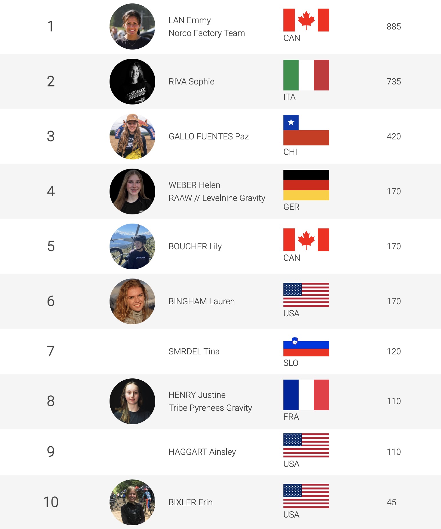A la 3e place, on retrouve Harriet Harnden, qui a profité des déboires de ses compatriotes Bex Baraona et Ella Conolly à Loudenvielle pour les dépasser au classement général et monter sur la dernière marche du podium final.