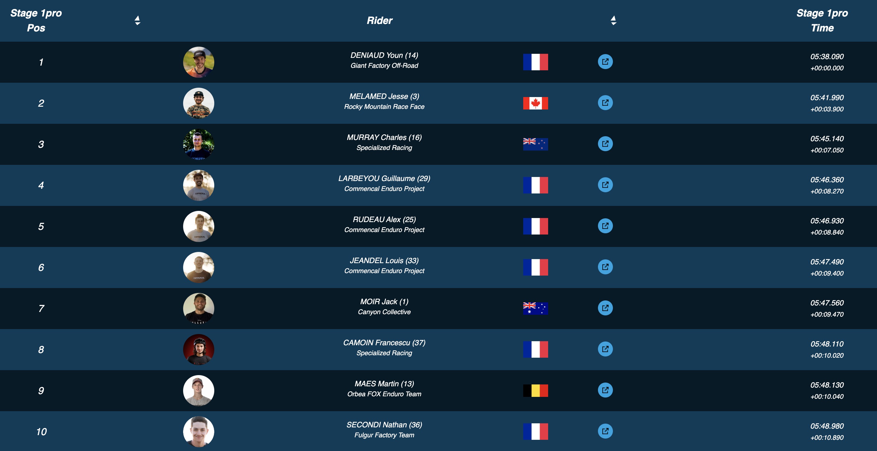 Si les écarts sont moindres que chez les femmes, il y a davantage de surprises du côté des hommes… à commencer par la première place de Youn Deniaud ! Le Français s’offre un beau scratch et se paie même le luxe de devancer de 3 secondes le leader du classement général EWS, Jesse Melamed. 3e à 7 secondes du meilleur temps, Charles Murray devance une brochette de Français : Guillaume Larbeyou, Alex Rudeau et Louis Jeandel. Tiens, il ne manque que Dimitri Tordo (18e) et on a là les pilotes qui composeront l’équipe française lors du Trophée des Nations la semaine prochaine !