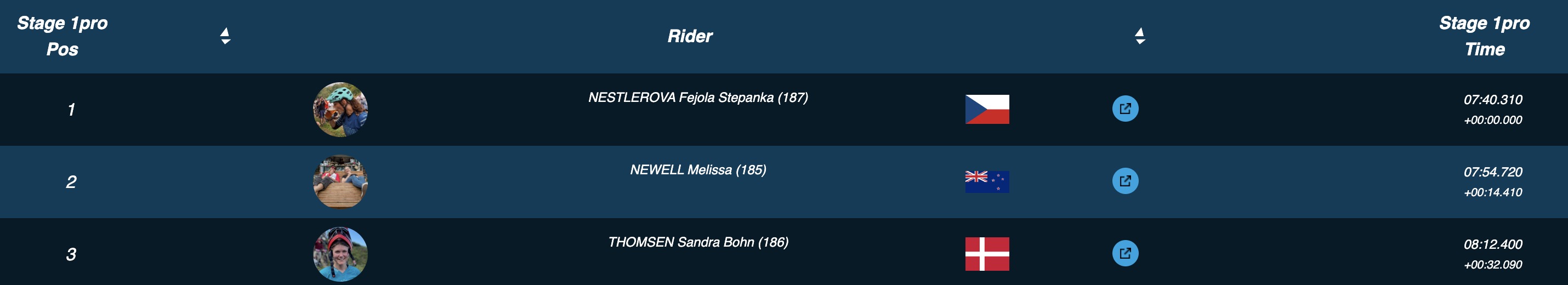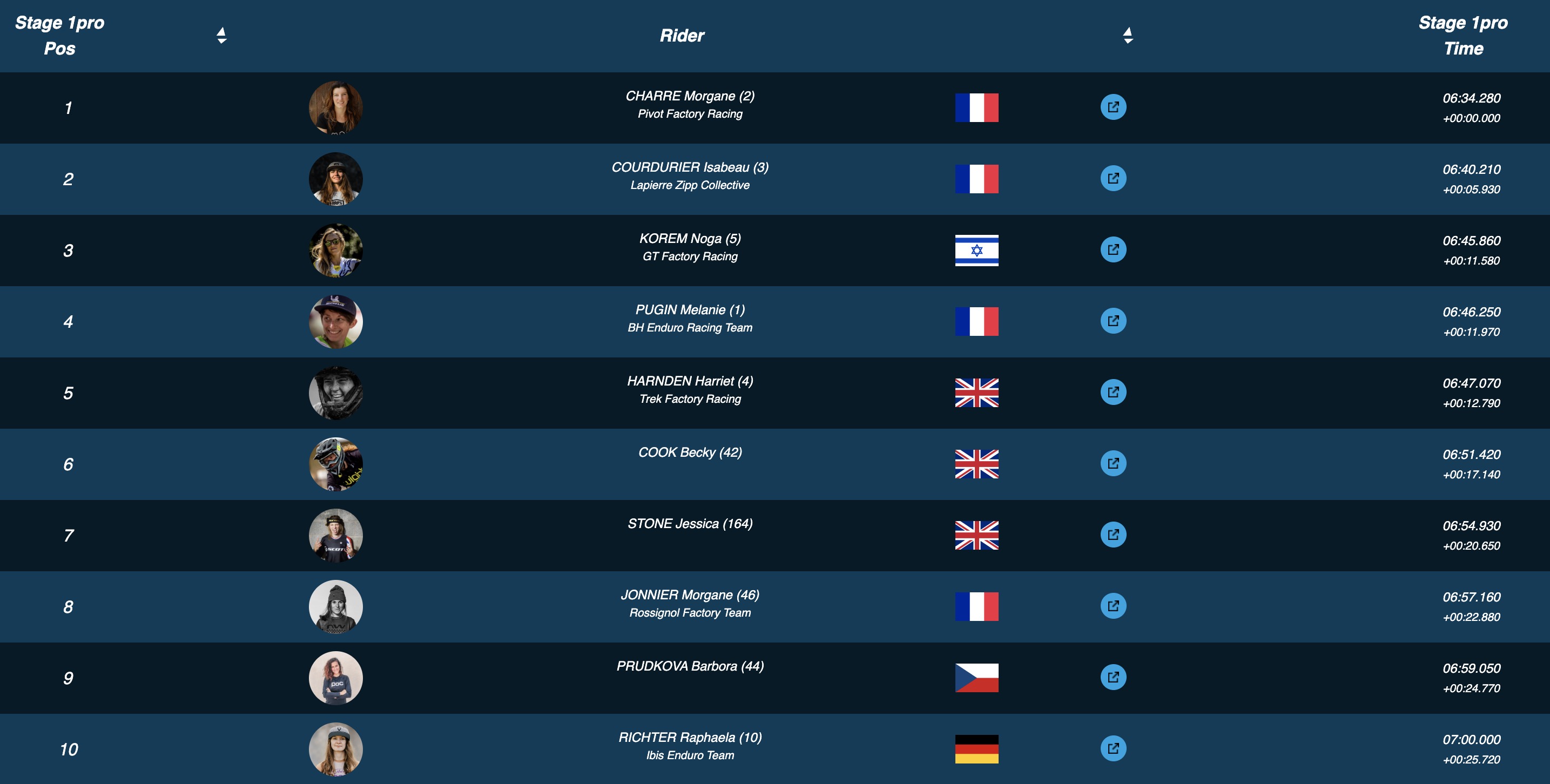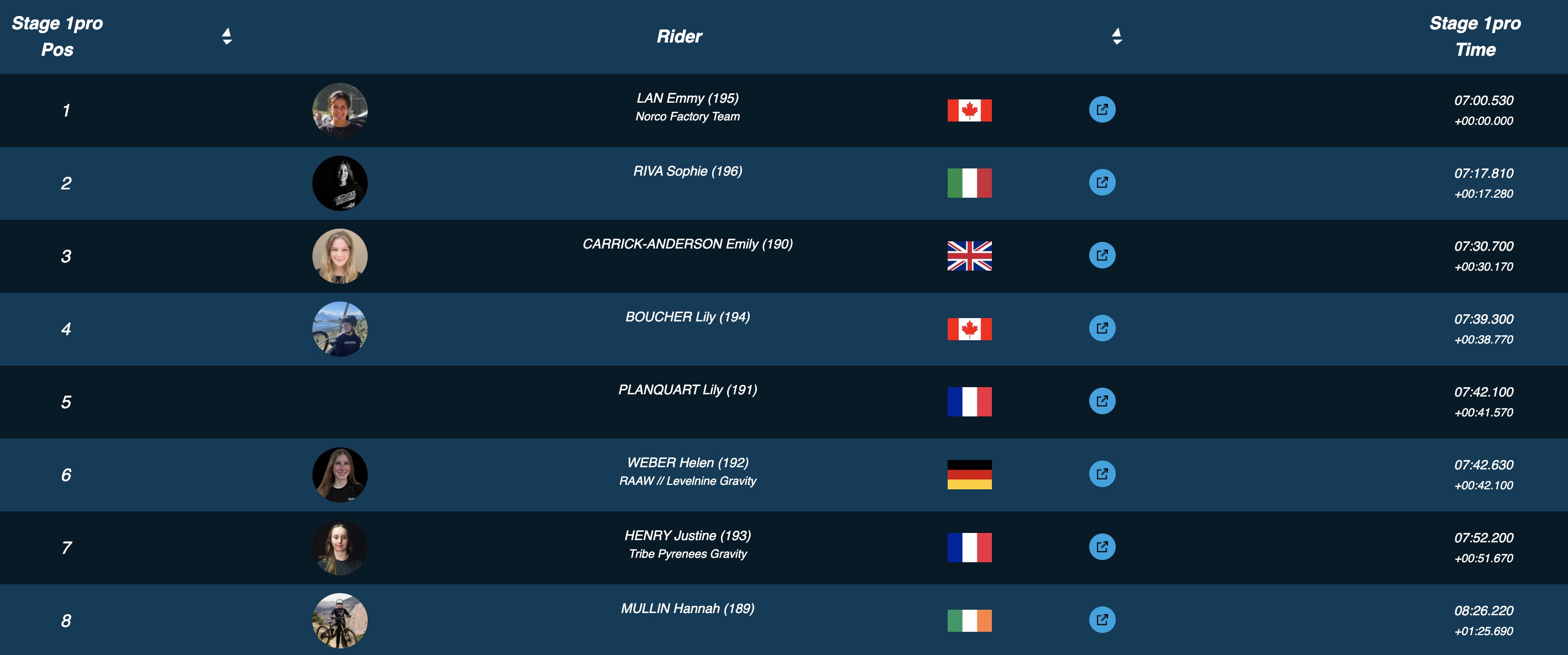 Andréane Lanthier-Nadeau est pour l’instant 11e à 25 secondes et Bex Baraona 29e avec 1 minute 44 de retard, sans doute suite à une chute ou un problème mécanique. Ella Conolly n’a quant à elle pas terminé la spéciale, sans qu’on sache pour l’instant quelle en est la raison.