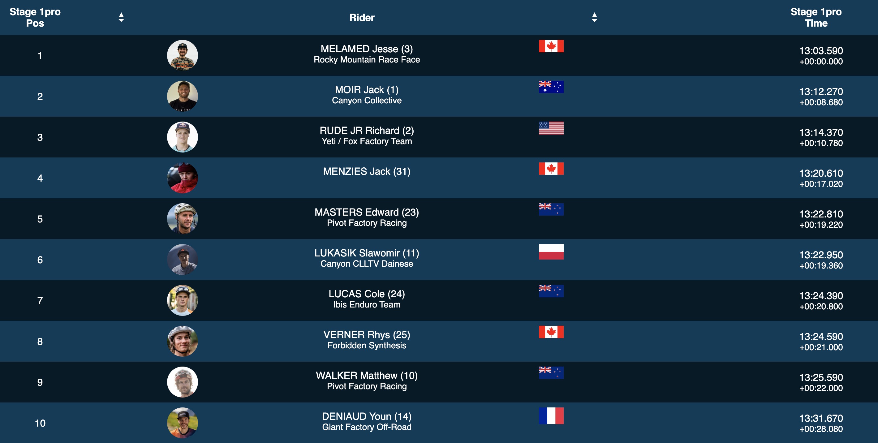 Slawomir Lukasik (6e), Cole Lucas (7e), Rhys Verner (8e), Matt Walker (9e) et Yound Deniaud (10e) complètent le top 10 et comptent tous entre 19 et 28 secondes de retard sur Melamed.