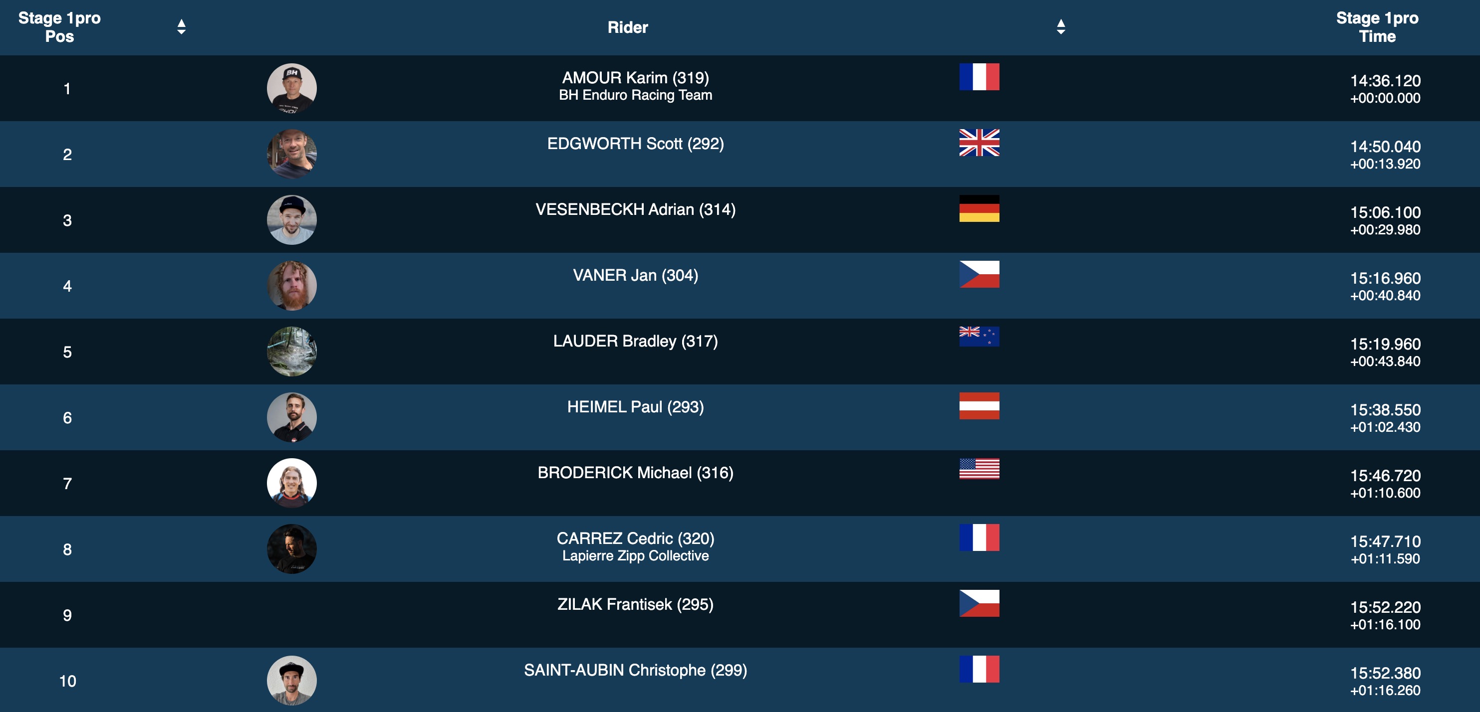 Seulement 4e à Tweed Valley, Karim Amour a bien entamé son week-end de course en Autriche en signant le scratch dans cette Pro Stage avec une belle avance. Le Britannique Scott Edgworth et l’Allemand Adrian Vesenbeckh sont pour l’instant 2e et 3e à respectivement 13 et 29 secondes.