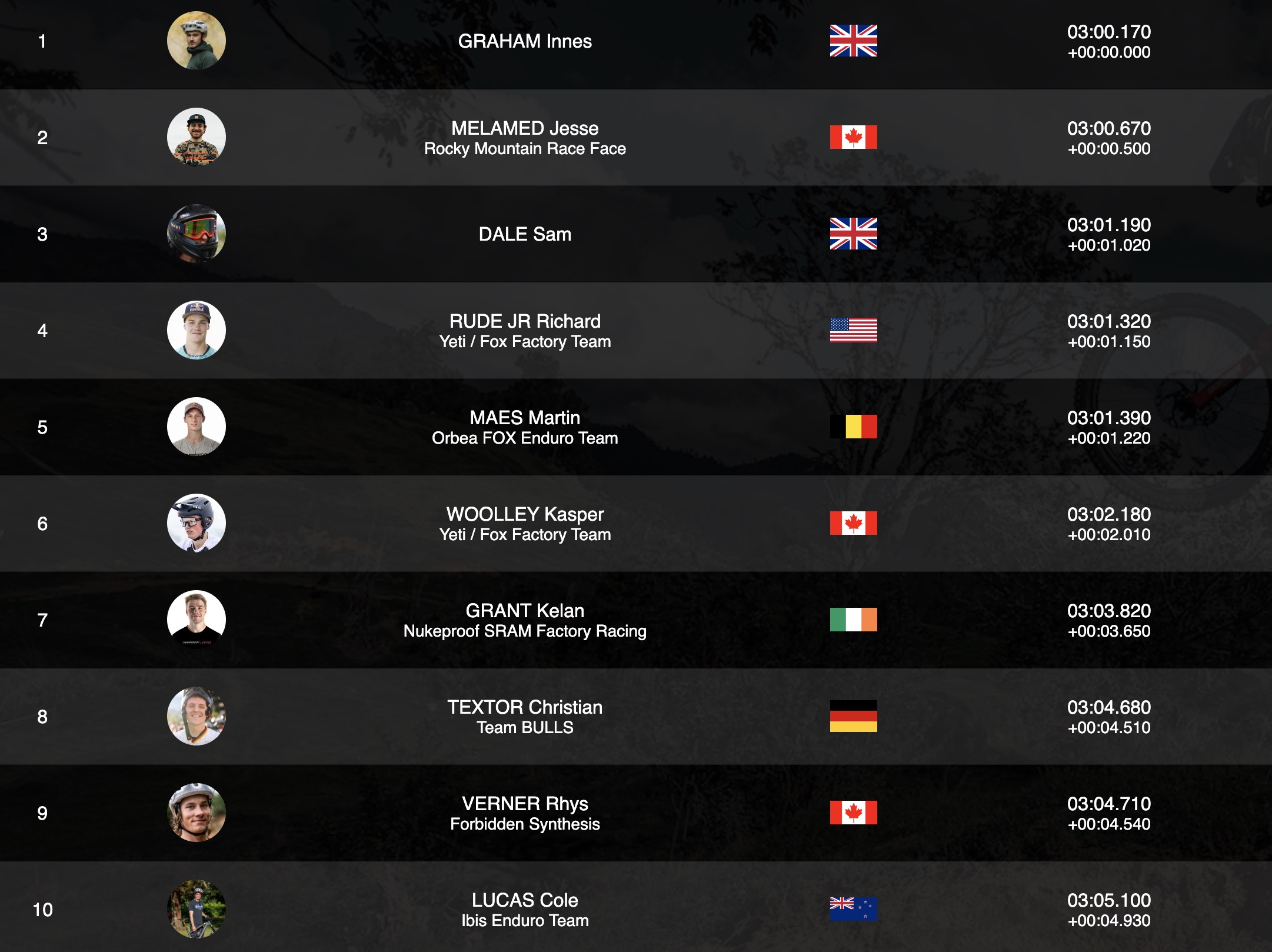 Eh bien, il y a déjà de sacrées surprises chez les hommes au terme de cette 1ère spéciale du week-end ! Elles nous viennent notamment des Britanniques, avec le scratch inattendu du local Innes Graham, ancien espoir de la descente qui dispute là une de ses premières courses en enduro, et la 3e place de Sam Dale. Entre les deux, on retrouve Jesse Melamed à pile une demie seconde du meilleur temps tandis que Richie Rude et Martin Maes sont en embuscade aux 4e et 5e places. Ce top 5 se tient en à peine plus d’une seconde !