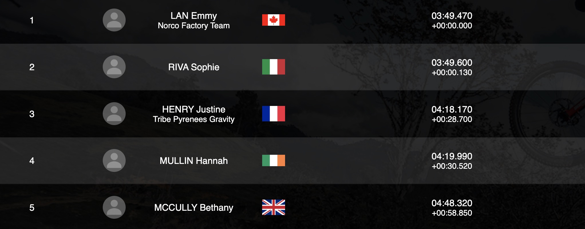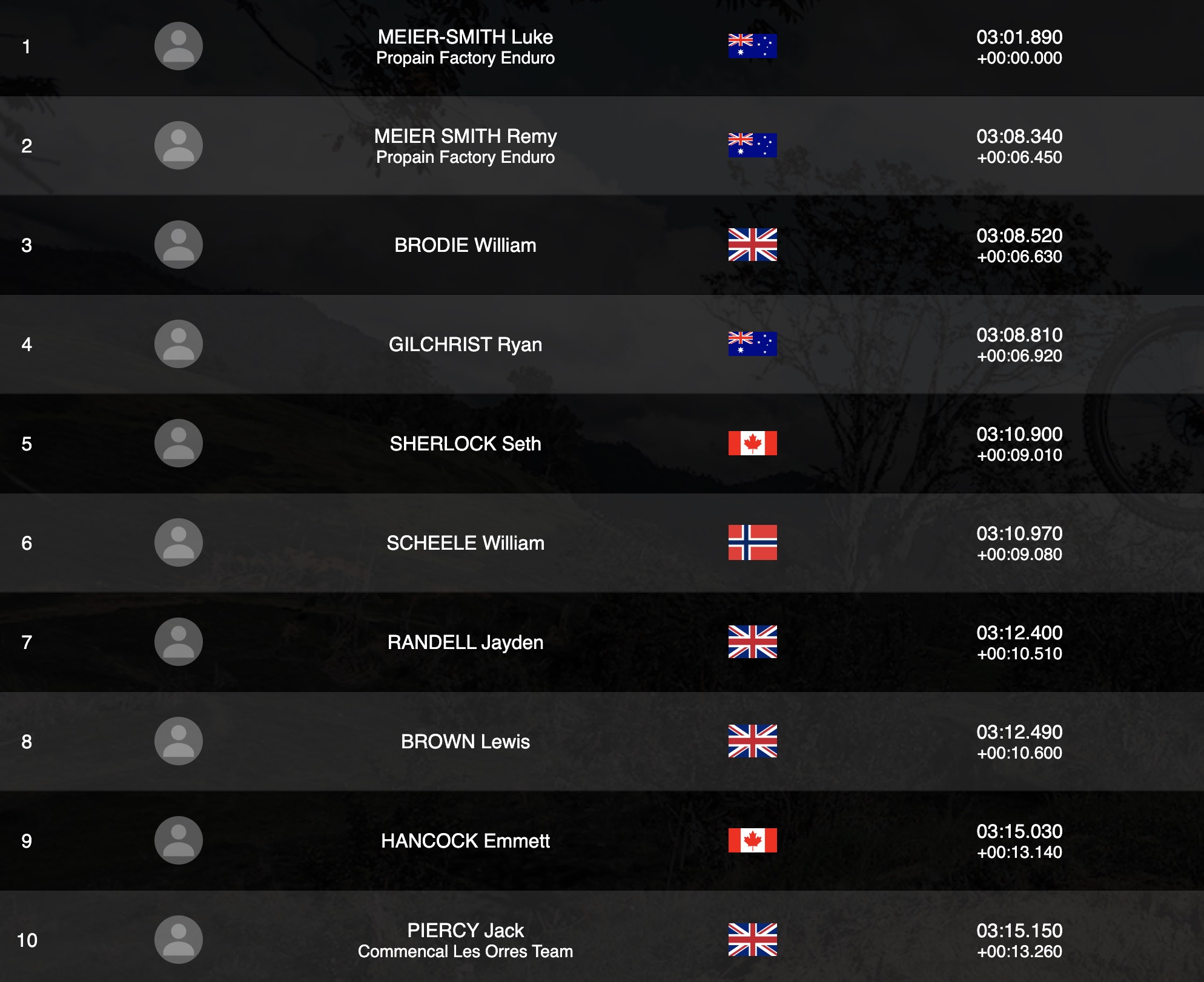 Deux frangins aux deux premières places, voilà qui n’est pas courant ! Luke Meier-Smith devance en effet son frère Remy Meier-Smith dans cette Pro Stage, avec un écart de 6 secondes et demie. Mais Remy, qui pour info avait pris la 3e place en Juniors lors de la Coupe du monde de descente à Fort William il y a deux semaines, devra se méfier de William Brodie et Ryan Gilchrist qui sont pour l’instant dans la même seconde que lui…
