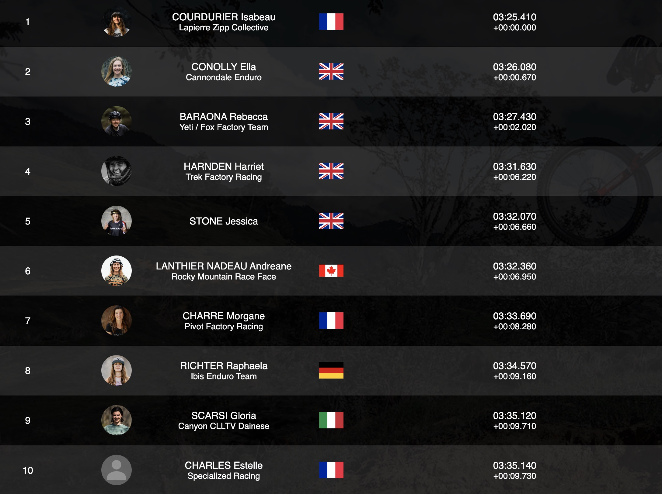 Comme prévu, les Britanniques sont en grande forme sur leurs terres et occupent quatre des cinq première places. Pourtant, c’est bien une Française qu’on retrouve tout en haut du classement de la Pro Stage : Isabeau Courdurier ! La pilote Lapierre montre d’entrée de jeu qu’il faudra compter avec elle ce week-end et cette saison, mais attention, son avance n’est que de 0.670s. C’est Ella Connoly qui emmène l’armada anglaise, suivie de Bex Baraona, Harriet Harnden et Jessica Stone.