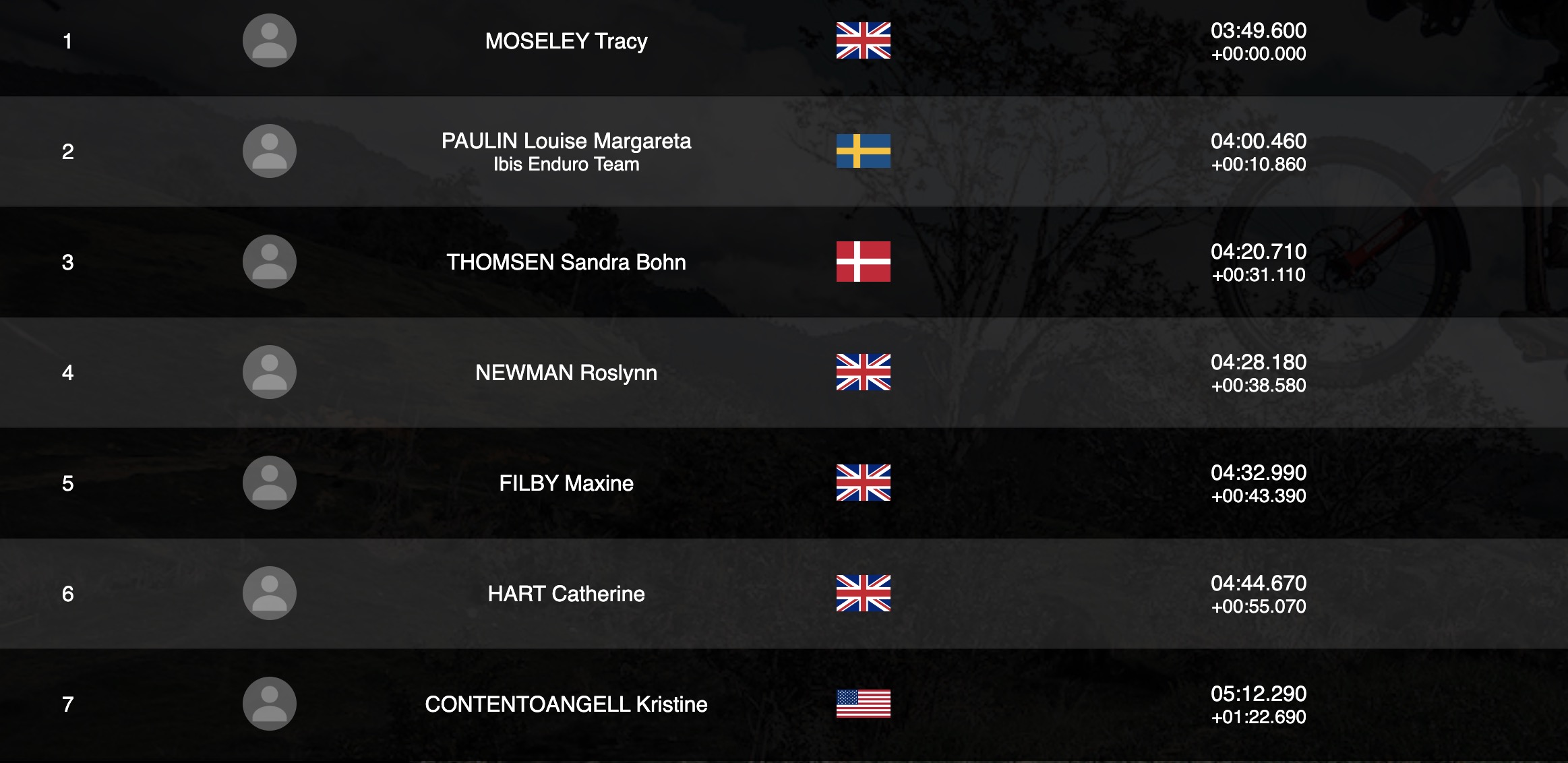 C’est une véritable légende du VTT qu’on retrouve pour l’instant en tête chez les Femmes Masters 35+ ! Championne du monde de descente en 2010 puis plusieurs fois titrée en EWS, Tracy Moseley est de retour aux affaires, et visiblement elle n’a pas perdu son bon coup de guidon… La Britannique compte quasi 11 secondes d’avance pour l’instant, mais elle devra se méfier de Louise Paulin qui domine la catégorie depuis plusieurs années et est en embuscade à la 2e place.