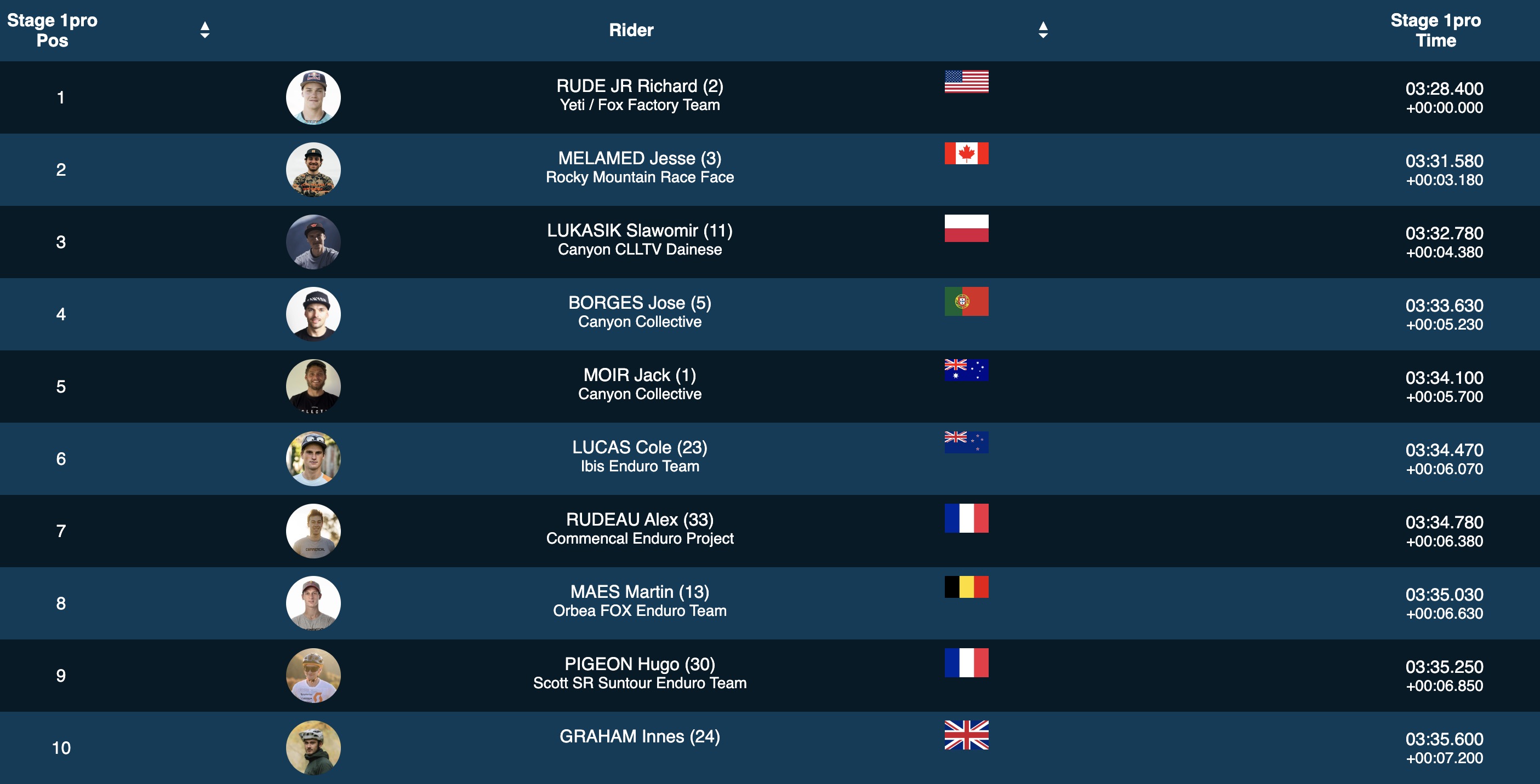 Chez les hommes, les temps étaient très serrés dans cette Pro Stage avec pas moins de sept pilotes qui se tenaient en 2 secondes… jusqu’à ce que Richie Rude, avant-dernier à s’élancer, ne vienne repousser tout ce beau monde à plus de 4 secondes ! Impuissant, Jesse Melamed échouera ensuite à 3 secondes de l’Américain. Slawomir Lukasik prend une belle 3e place à un peu plus de 4 secondes de Rude alors que Jose Borges et Jack Moir, respectivement 4e et 5e, sont déjà à plus de 5 secondes.