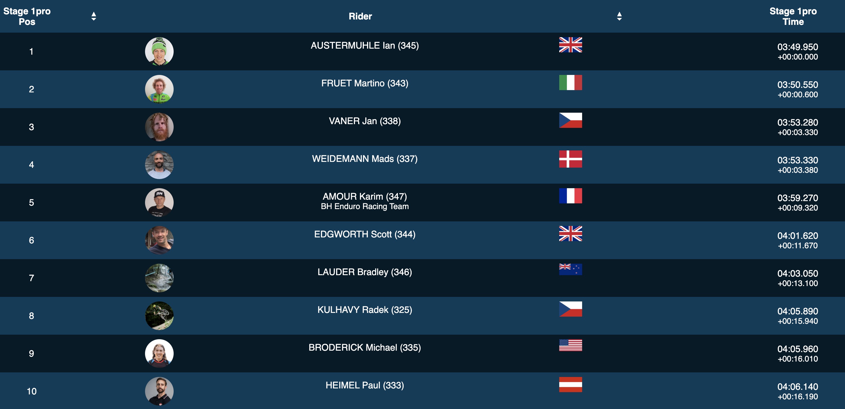 C’est plutôt serré du côté des Masters 35+ : Ian Austermuhle remporte cette Pro Stage, mais Martino Fruet n’est qu’à 0.6 seconde alors que Jan Vaner et Mads Weidemann sont tous deux à un peu plus de trois secondes du leader. Auteur du 5e temps, Karim Amour est lui déjà relégué à plus de 9 secondes.