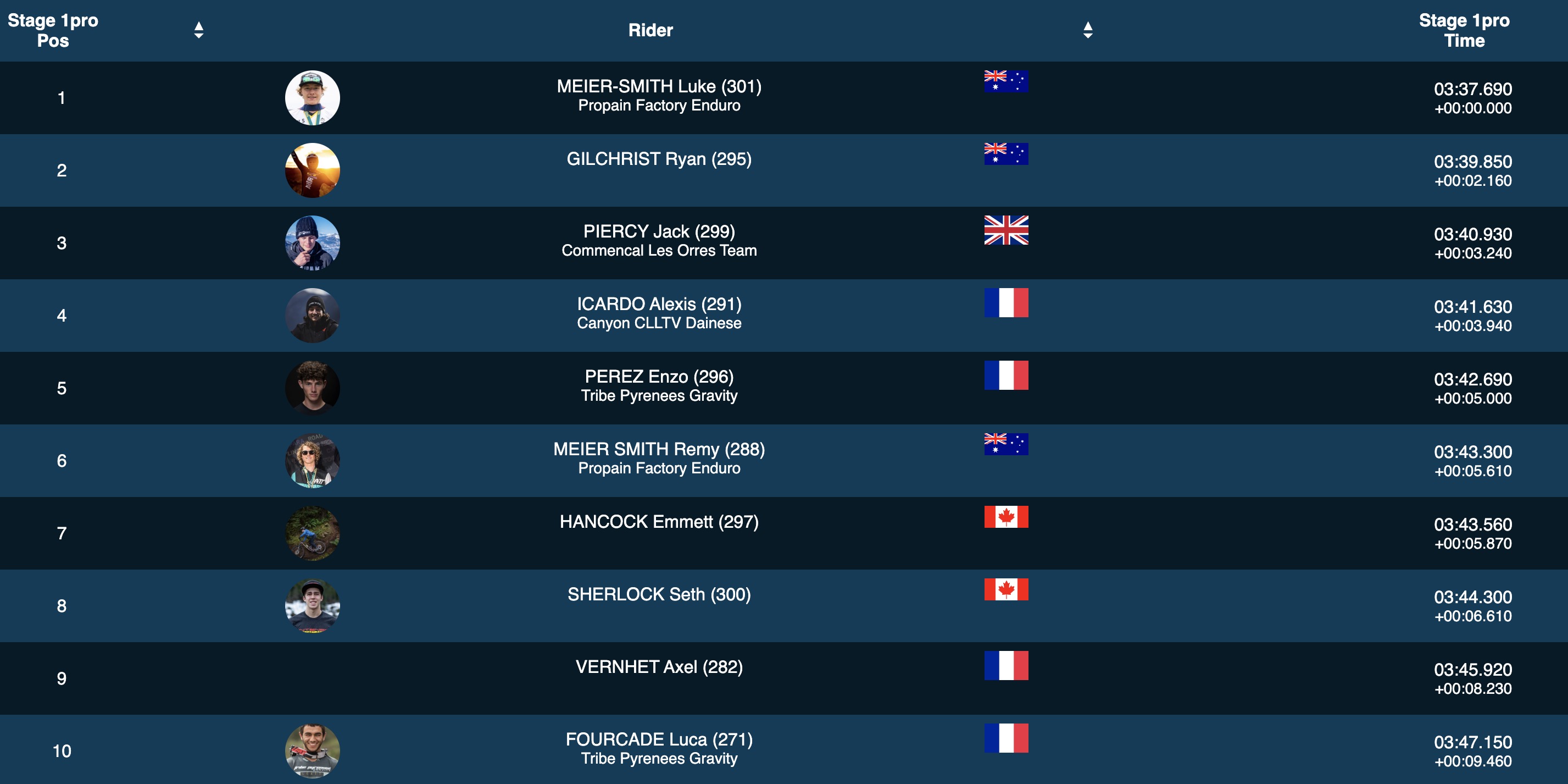 Déjà victorieux lors des deux premières manches, Luke Meier-Smith continue sur sa lancée et donne le ton dès la Pro Stage : il signe le scratch avec un peu plus de deux secondes d’avance. Ryan Gilchrist prend la 2e place et Jack Piercy la 3e, à +3.240s du meilleur temps. Deux Français complètent le top 5 : Alexis Icardo (+3.940s) et Enzo Perez (+5s). Seth Sherlock, deuxième du classement général actuel, ne signe que le 8e temps à 6.610s de Meier-Smith.