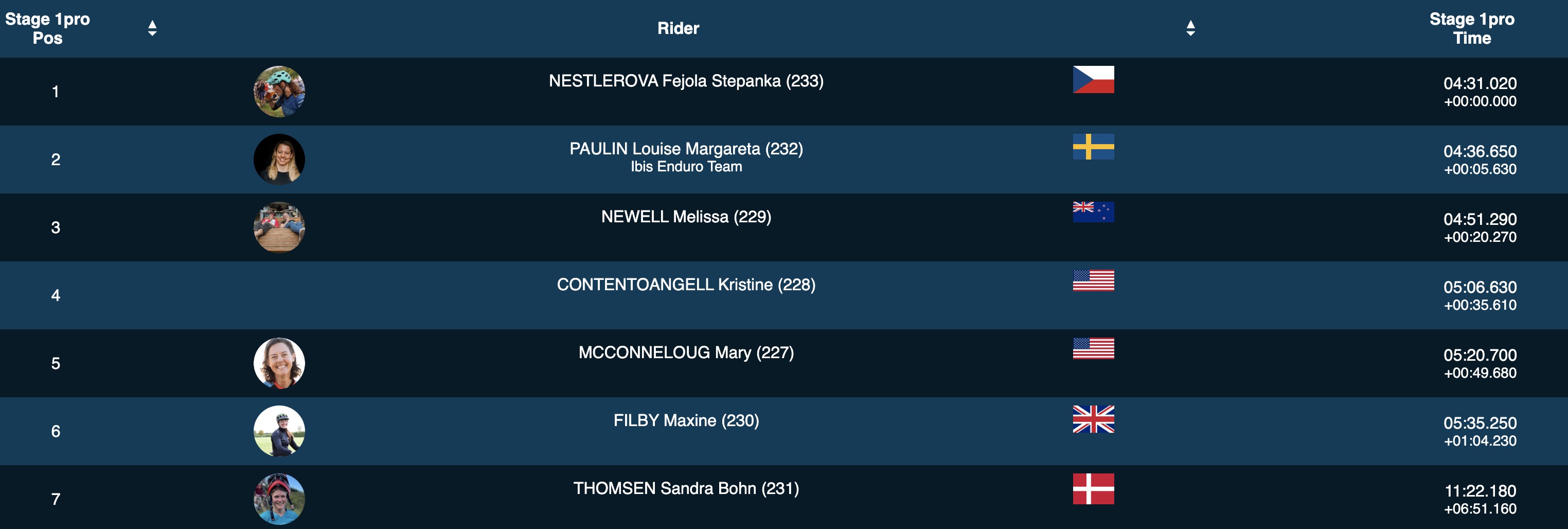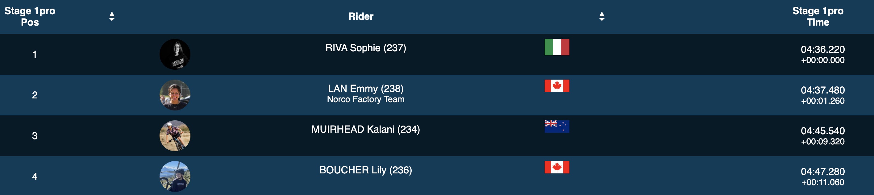 Chez les Femmes U21, on notera la belle performance de Sophie Riva qui s’impose dans cette Pro Stage devant Emmy Lan, intouchable et intraitable cette saison. Mais avec seulement 1.260s d’avance, la jeune Italienne devra être solide demain pour résister au retour de la Canadienne. Kalani Muirhead occupe pour l’instant la 3e place mais elle compte déjà plus de 9 secondes de retard.