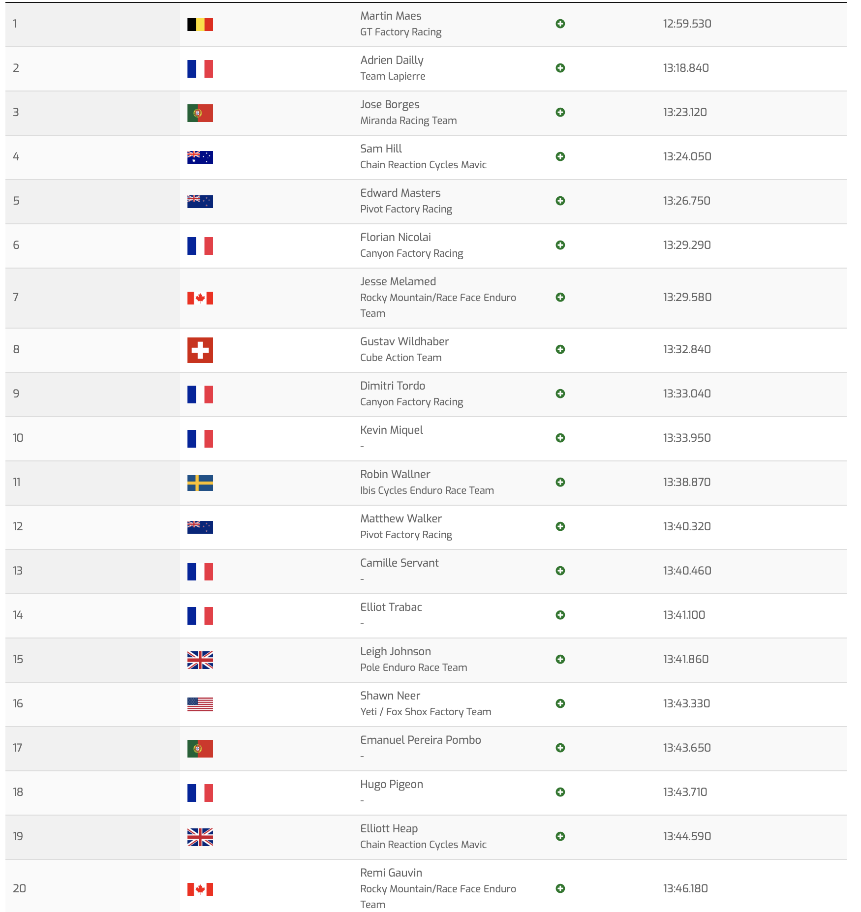 Derrière Maes et Dailly, le local portugais José Borges se montre prophète en son pays et termine la journée en 3e position, juste devant Sam Hill. Suivent, dans l’ordre et en à peine plus de 7 secondes Ed Masters, Flo Nicolaï (photo), Jesse Melamed, Gustav Wildhaber, Dimitri Tordo et Kevin Miquel. Camille Servant, Eliott Trabac et Hugo Pigeon sont aussi dans le top 20.