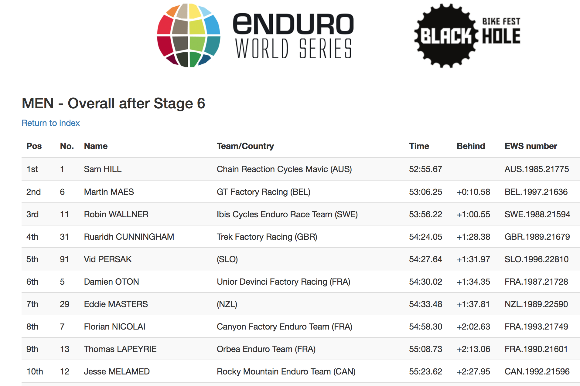 Excellente performance de la part de Ruaridh Cunningham pour sa première saison complète en EWS, il termine quatrième. Le local Vid Persak a tenu bon et se place cinquième;