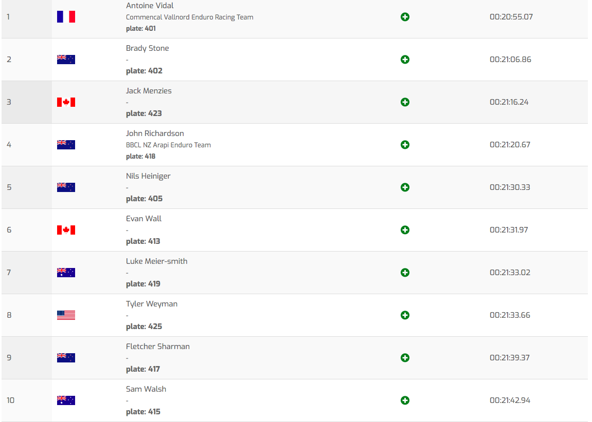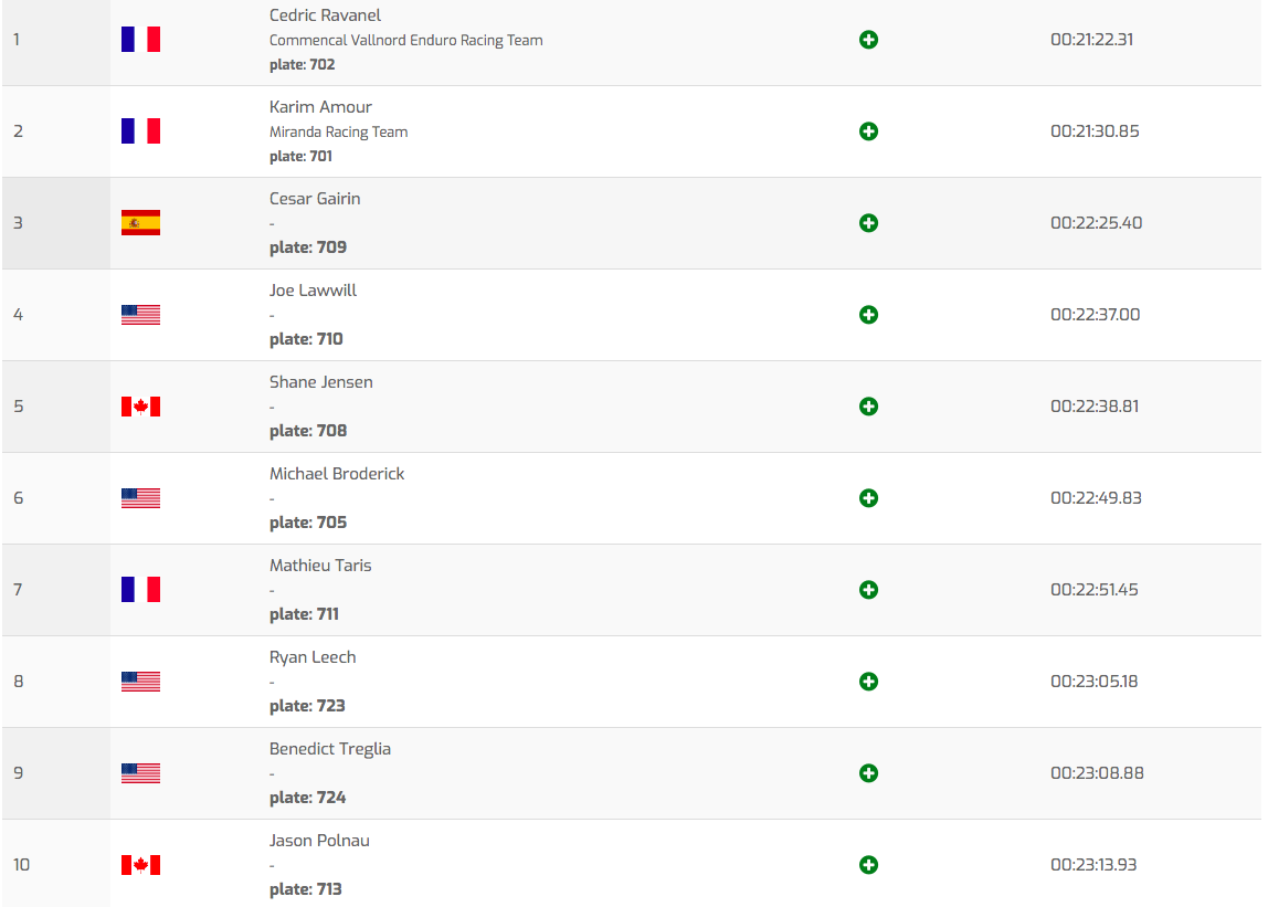 Hill et Gauvin (8e à 56 secondes) sont les deux seuls pilotes du top 10 du classement EWS actuel à céder moins d’une minute à Rude dans cette Queen Stage. Ed Masters, lui, est actuellement 13e à pile une minute du leader, Florian Nicolai est 20e (+1’13 »), Kevin Miquel 22e (+1’14 »), Robin Wallner 25e (+1’18 »), Adrien Dailly 26e (+1’18 »), et Dimitri Tordo 29e (+1’24 »). Jesse Melamed est de retour à la compétition « en mode cool » après son gros crash à Val Di Fassa et pointe pour l’instant à la 78e place. Victimes de souci techniques, Greg Callaghan et Youn Deniaud terminent respectivement 109e et 110e sur 111, à plus de 8 minutes de Richie Rude. Dans le top 10 provisoire, on retrouve aussi Morgane Charre (6e), Ines Thoma (7e), Rae Morrison (8), Jill Kintner (9e) et Jennifer Makgill (10e). Chez les Masters, c’est Cédric Ravanel qui s’est montré le plus rapide en reléguant son compatriote Karim Amour à 8 secondes et Cesar Gairin à plus d’une minute. Louise Paulin fait de même du côté des Dames Masters et abordera la deuxième journée avec 40 secondes d’avance sur sa plus proche poursuivante. Du côté des plus jeunes, Antoine Vidal poursuit sa domination quasi totale cette saison en raflant les 25 points de la Queen Stage, qu’il remporte en se montrant une bonne dizaine de secondes plus rapide que Brady Stone, 2e, tandis que Jack Menzies, 3e, est à 20 secondes du Francais. Les Dames U21 sont seulement 6 au départ, et c’est pour l’instant la Chilienne Paz Gallo Fuentes qui occupe la tête avec un peu plus de 5 secondes d’avance sur l’Américaine Isabella Naughton et la Canadienne Lucy Schick. Rendez-vous ce lundi matin sur Vojo pour les résultats finaux au terme de la deuxième journée et des cinq autres spéciales au programme.Dames