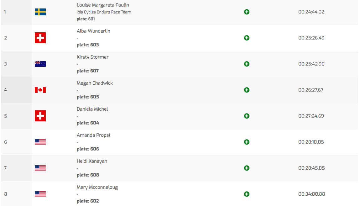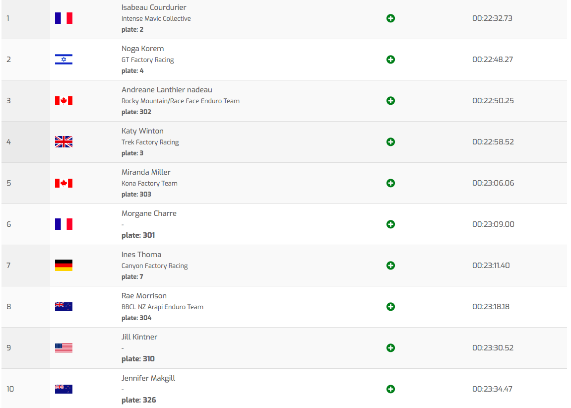 La saison parfaite continue pour Isabeau Courdurier, toujours invaincue sur les manches comme sur les Queen Stages ! Elle remporte celle-ci avec la manière : Noga Korem, 2e du classement général après les 5 premières étapes de la saison, prend la 2e place de la spéciale à 16 secondes de Courdurier tandis qu’Andréane Lanthier-Nadeau, qui roule devant son public ce week-end, est à deux secondes seulement de l’Israëlienne. Katy Winton, elle, semble doucement retrouver son niveau après sa grosse commotion du début de saison puisqu’elle pointe pour l’instant à la 4e place, juste devant Miranda Miller, 5e.Masters