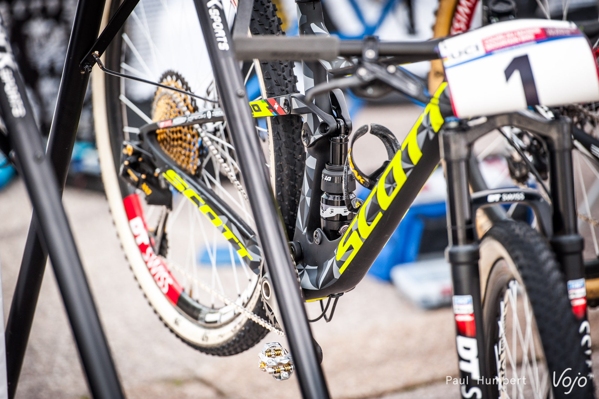 L’amortisseur utilisé par Nino Schurter est le nouveau DT Swiss R414 high volume, placé avec le piston vers le haut. Cela peut présenter plusieurs avantages : la partie la plus lourde de l’amortisseur est placée au plus bas pour encore abaisser le centre de gravité, seule la partie la plus légère est mobile, ce qui améliore légèrement le fonctionnement de l’amortisseur et, dans le cas présent, cela permet d’avoir une biellette ultra compacte qui n’est pas gênée par la partie la plus imposante de l’amortisseur.