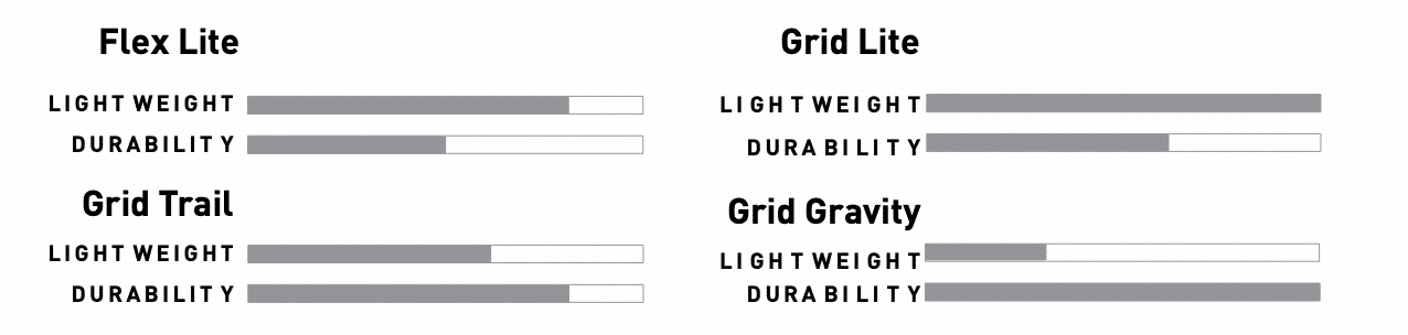 - Grid Trail : C’est la carcasse la plus polyvalente de la gamme, avec des renforts latéraux et une couche de protection de tringle à tringle.