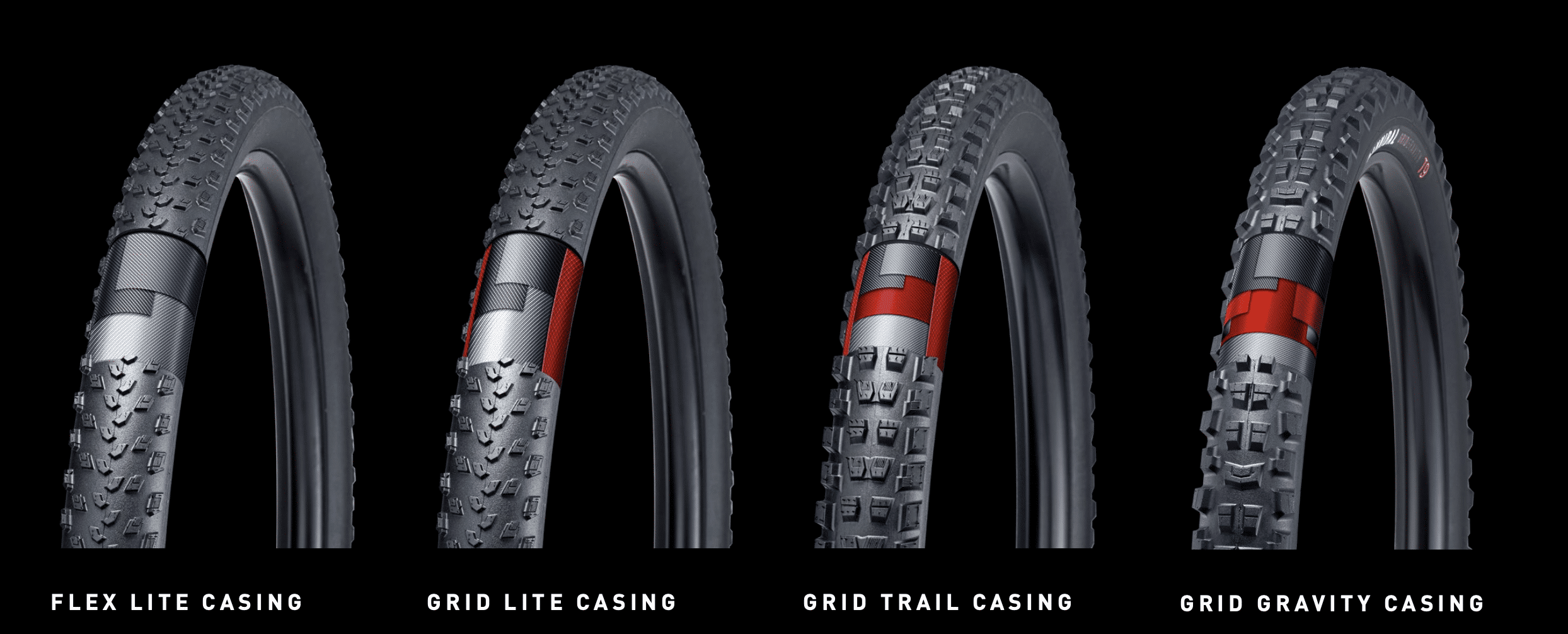 - Grip Lite (anciennement baptisée Grid) : cette carcasse XC/Trail vient ajouter des renforts sur les flancs du pneus pour renforcer ce qui est proposé par la carcasse Flex Lite.