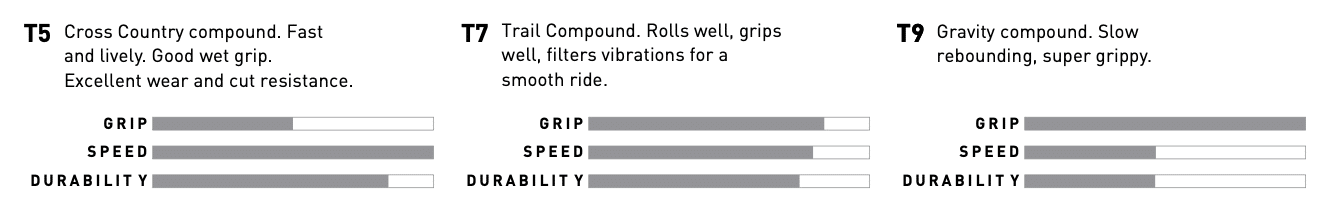 T5 : C’est la gomme utilisée pour le cross-country. Elle est définie par la marque comme « rapide et vivante », tout en apportant un bon grip en terrain mouillé. D’après la marque, elle résiste très bien à l’usure et aux entailles.