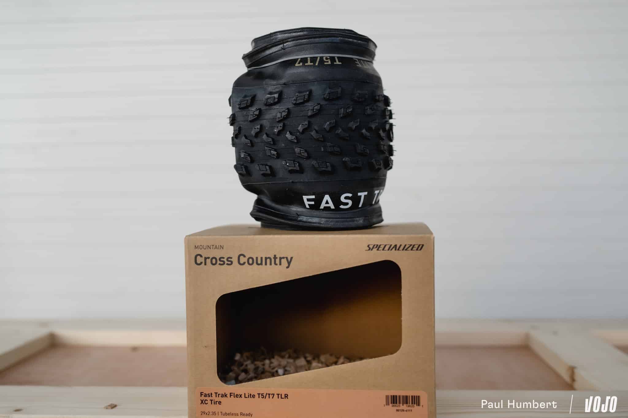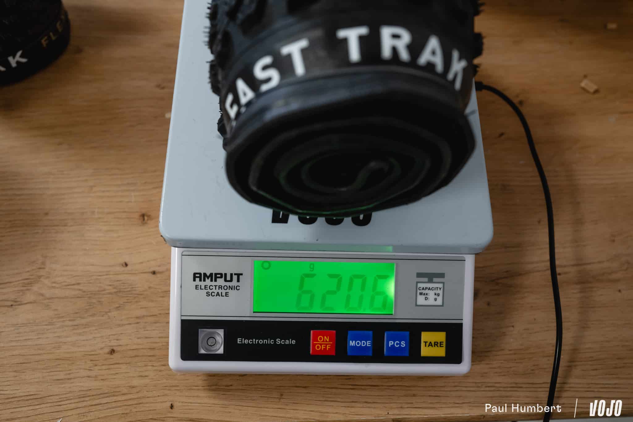 Nous avons pesé le pneu Specialized Fast Trak Flex Lite T5/T7 en section 29×2,35 à 620 g (annoncé à 615 g). À la caisse, le pneu est affiché à 50 euros.