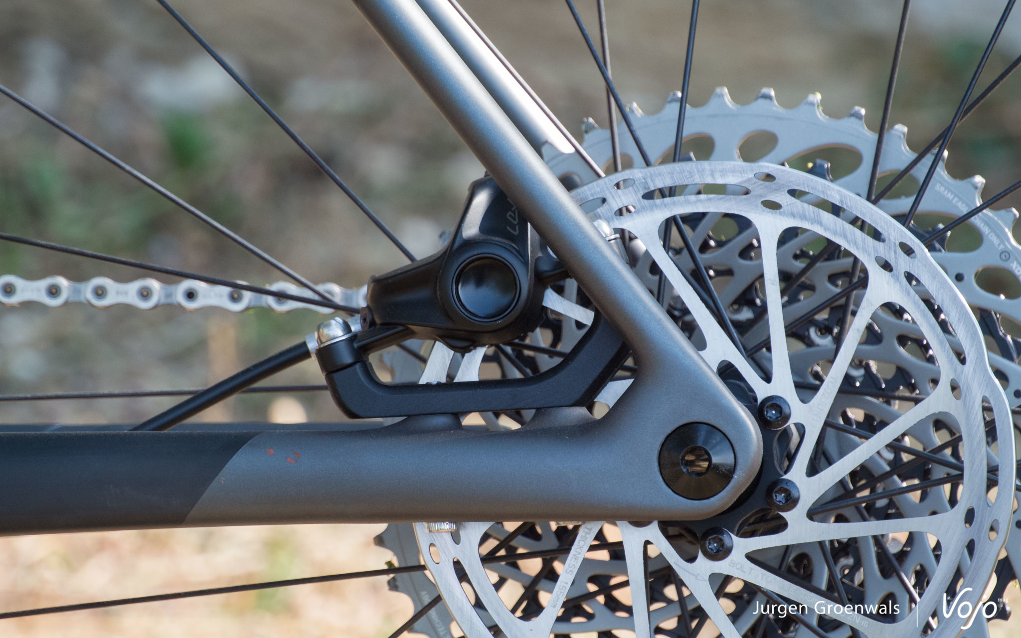 Avec un montage flatmount (à l’origine un standard route, qui tend à se développer aussi dans le vtt avec pour avantage de ne pas devoir fileter le cadre puisque les vis se fixent par le bas dans l’adaptateur qui est, lui, bel et bien fileté), l’étrier de frein se glisse en entre les bases et les haubans.