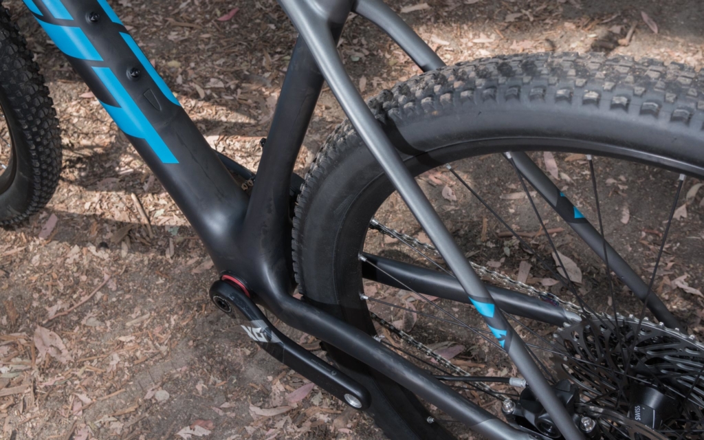 L’axe arrière est au standard Boost, ce qui a permis un raccourcissement des bases de 10 mm par rapport à son prédécesseur et l’utilisation combinée du BB92 au niveau du pédalier offre la possibilité de monter des pneus 29″ jusqu’à 2,35″ de large.