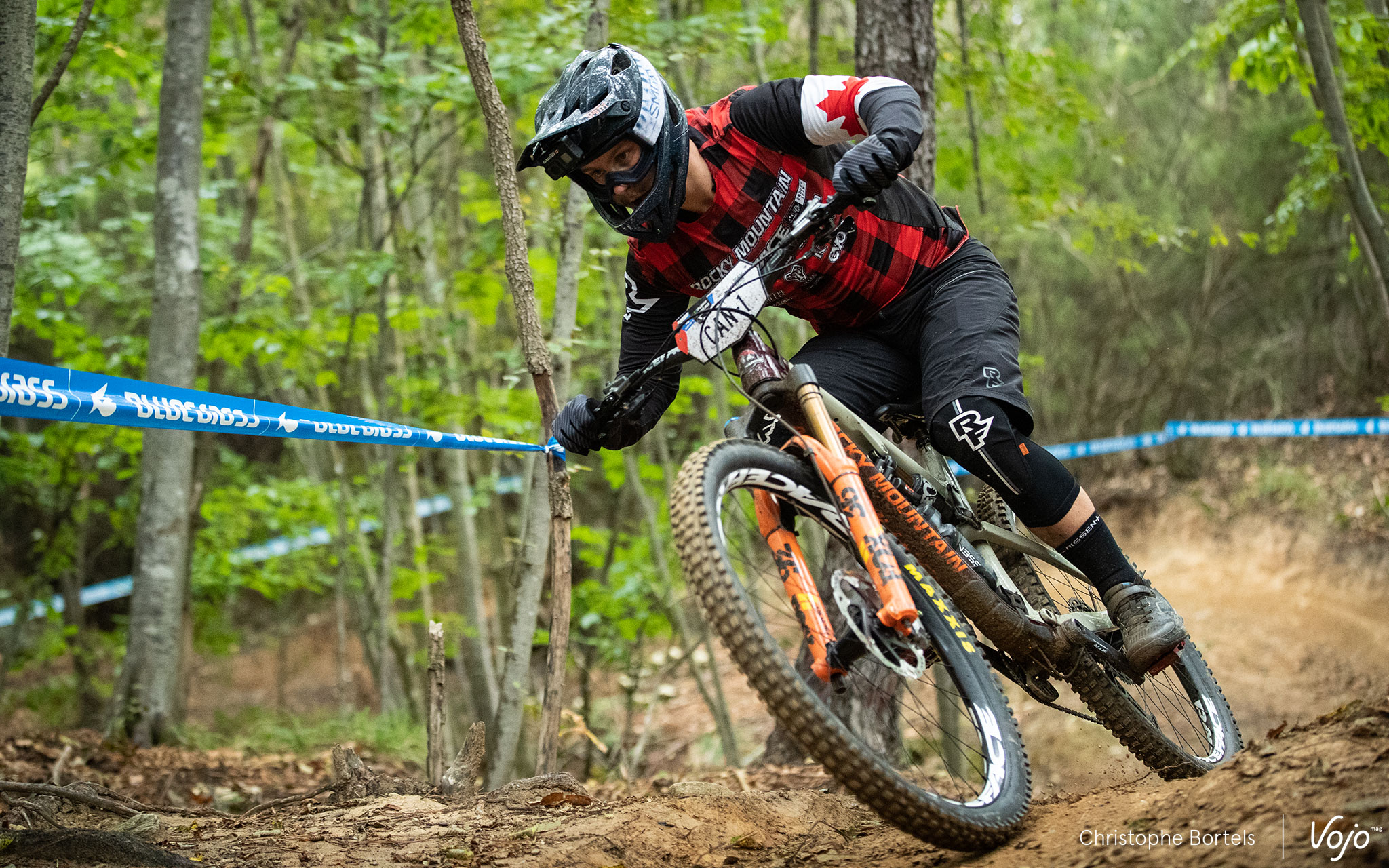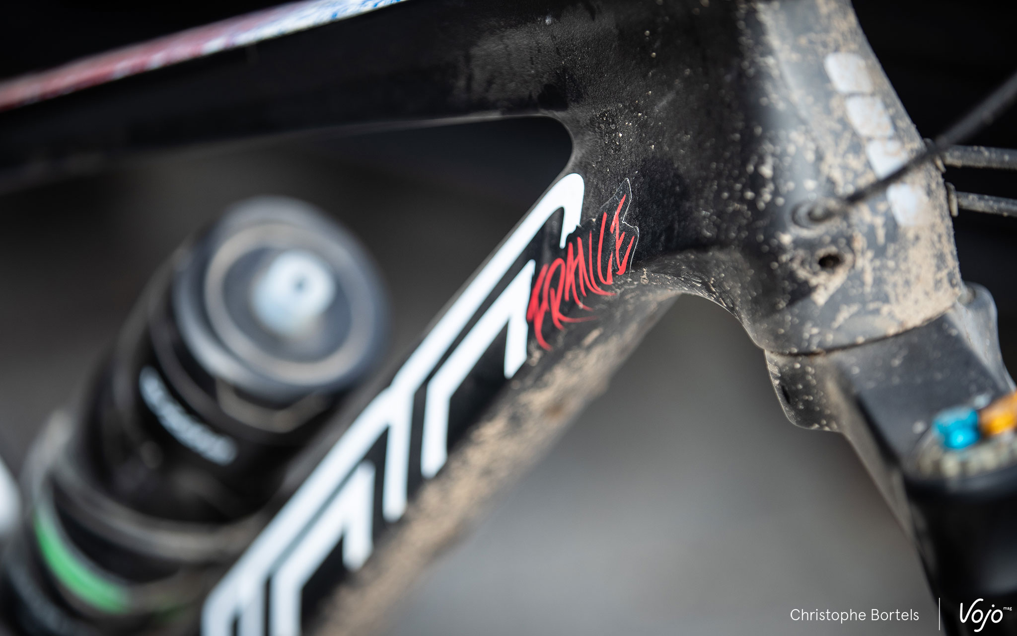 Pour l’occasion, les habituelles plaques de cadre avec le numéro qui reflète le classement EWS de l’année précédente ont laissé la place à une nomenclature particulière, identifiant le pays et la place du pilote au ranking global EWS, comme ici avec Remi Gauvin, Canadien et le mieux classé de son équipe.
