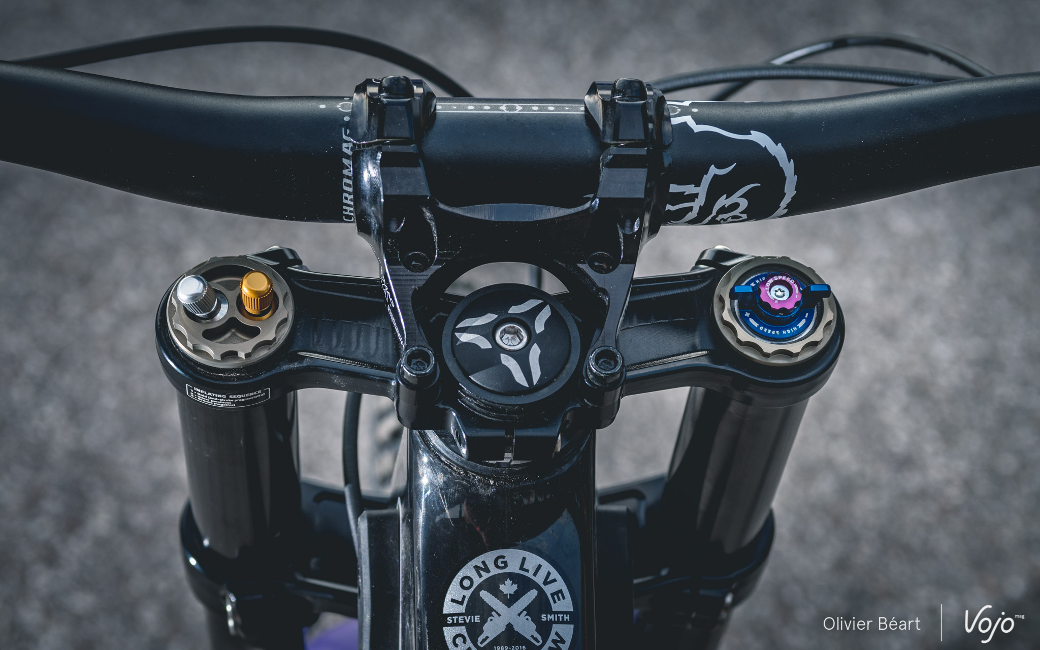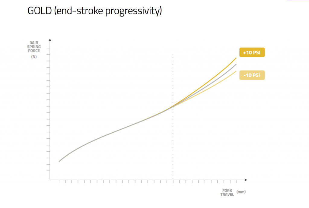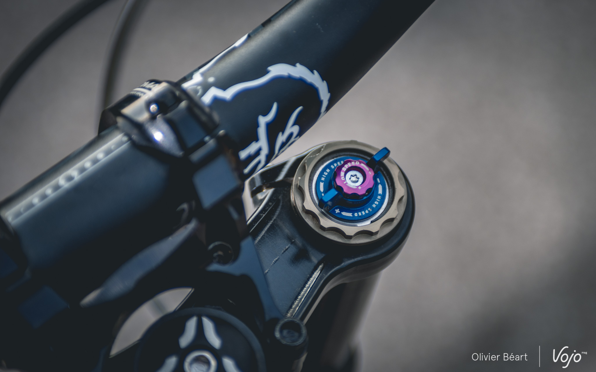 Pour faire simple, la chambre « gold » agit sur la progressivité de la deuxième moitié du débattement (de 110/120mm jusque 200), la « silver » est une chambre positive classique, qui va agir sur toute la courbe et qu’on va régler en fonction de son poids. Et enfin, la bronze est une chambre négative qui va agir sur le début de la courbe en rendant la fourche plus ou moins sensibles. A noter qu’elle doit toujours être dégonflée avant de toucher aux autres réglages, ce qui est une petite contrainte mais bien moindre que sur d’autres fourches où il faut mettre les mains dans le cambouis pour modifier autant de paramètres.