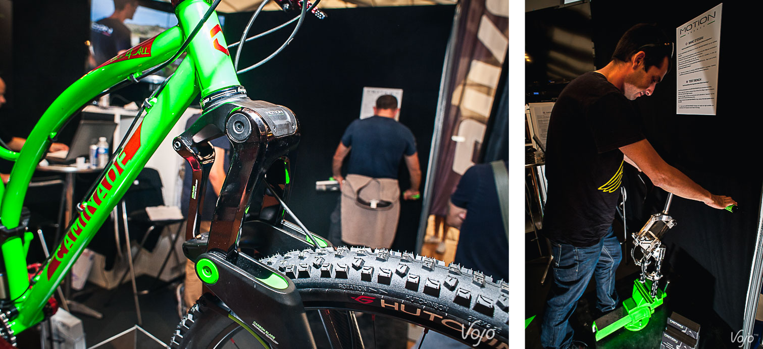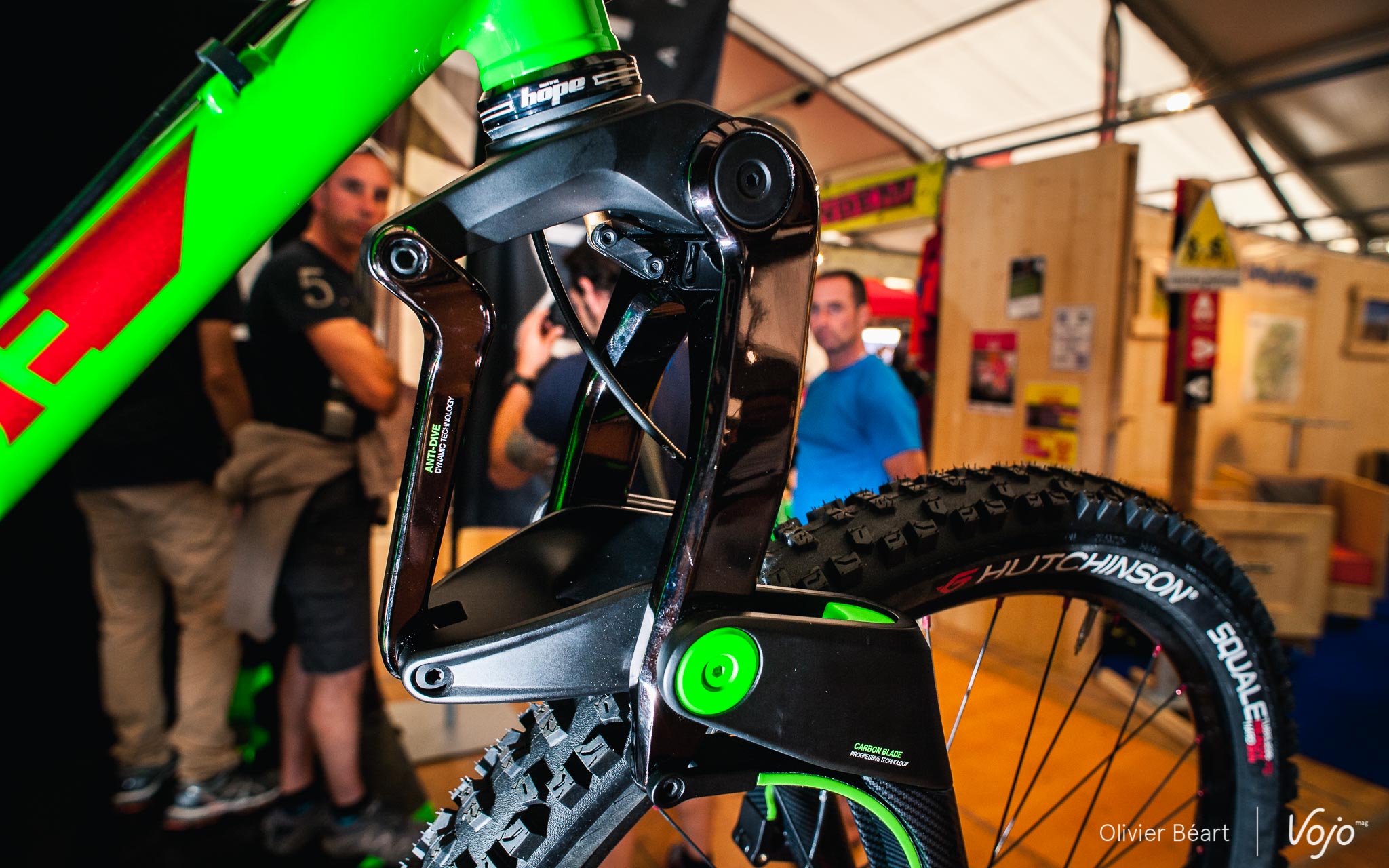 L’autre avantage de cette fourche, c’est sa sensibilité sur les petits chocs. Nous n’avons pas pu rouler avec la fourche, mais en appuyant à un seul doigt sur le proto de développement posé dans un coin du stand, on constate en effet que la fourche réagit. « Les biellettes sont montées sur des roulements surdimensionnés qui permettent de diminuer drastiquement les frictions par rapport à une fourche classique ».