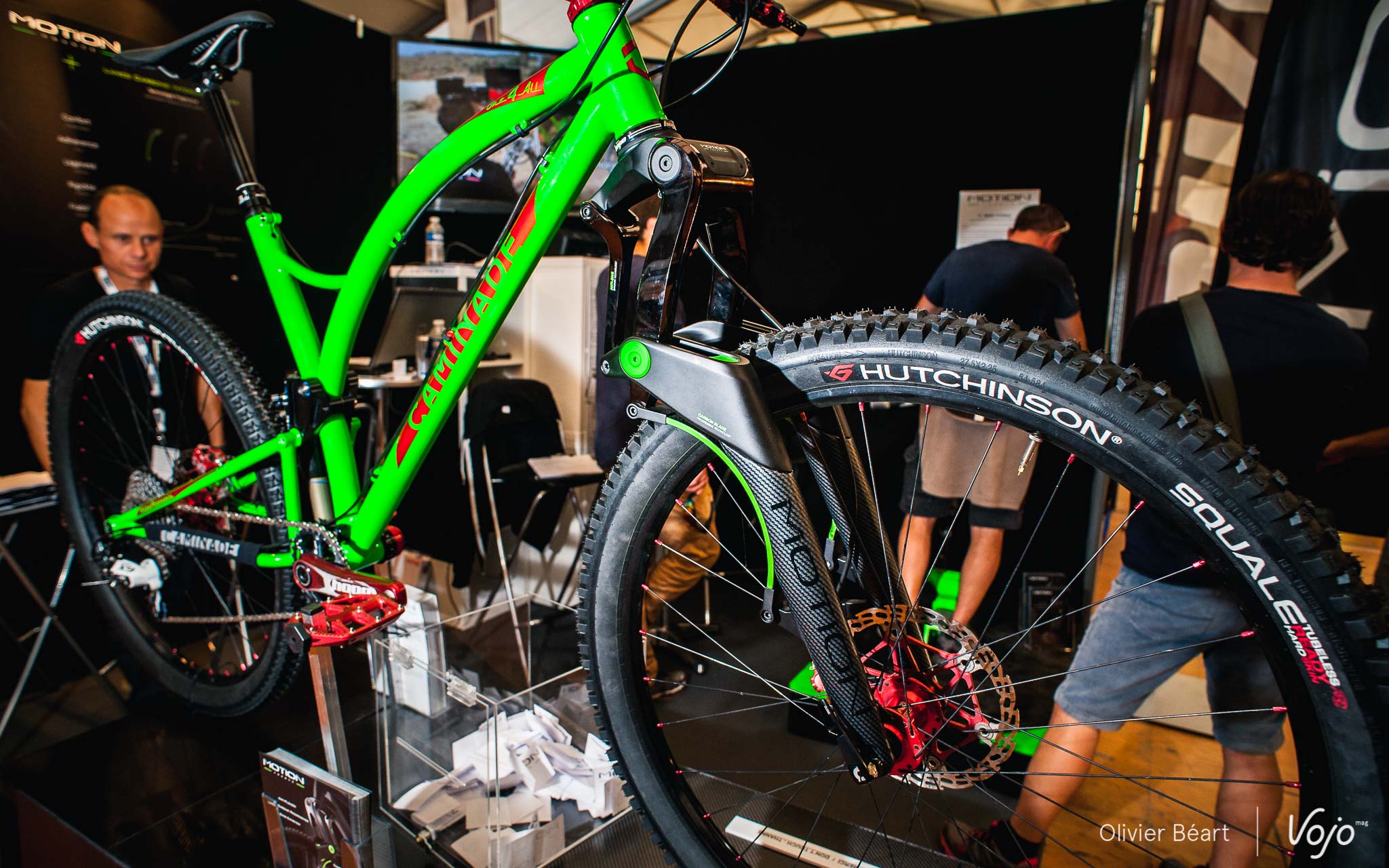 Jeune, simple, souriant et au discours technique convaincant, Matthieu Alfano est un jeune entrepreneur plein d’idées dont la société est basée en région Parisienne. « L’idée de cette fourche Motion France est d’annihiler les problèmes rencontrés avec les fourches classiques. Le premier, c’est la plongée au freinage, qui fait qu’on ne dispose plus de tout le débattement pour amortir les chocs dans une phase de pilotage critique. Pour cela, notre fourche Motion dispose d’une cinématique à biellettes unique et brevetée qui permet d’éviter ce phénomène quel que soit la puissance du freinage ou le poids du pilote. Le pompage est aussi très limité. »