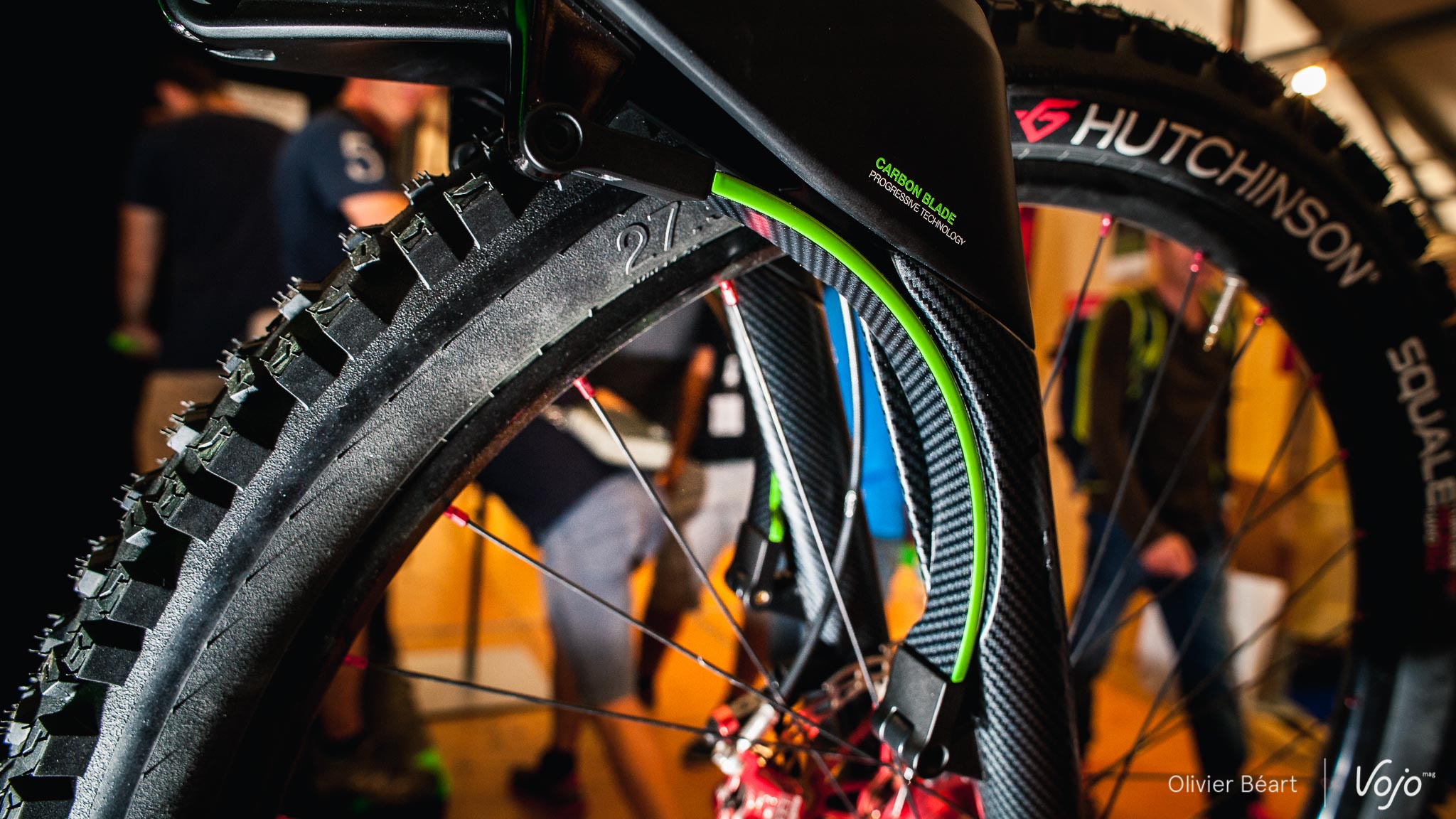 Autre différence avec la fourche Lauf, un dispositif hydraulique (cartouche fermée) est caché dans le pivot de fourche pour contrôler le rebond. « Malgré cela, l’entretien de la fourche est proche de zéro. Les roulements sont surdimensionnés, c’est une cartouche fermée, et nous avons conçu l’ensemble dans une optique de fiabilité maximale. » Au niveau des matériaux, la partie haute est en aluminium forgé et usiné, alors que le bas est en composite carbone « d’un type non encore utilisé dans le vélo », sans qu’on puisse en savoir plus pour le moment. L’axe avant est en 15x110mm (boost).