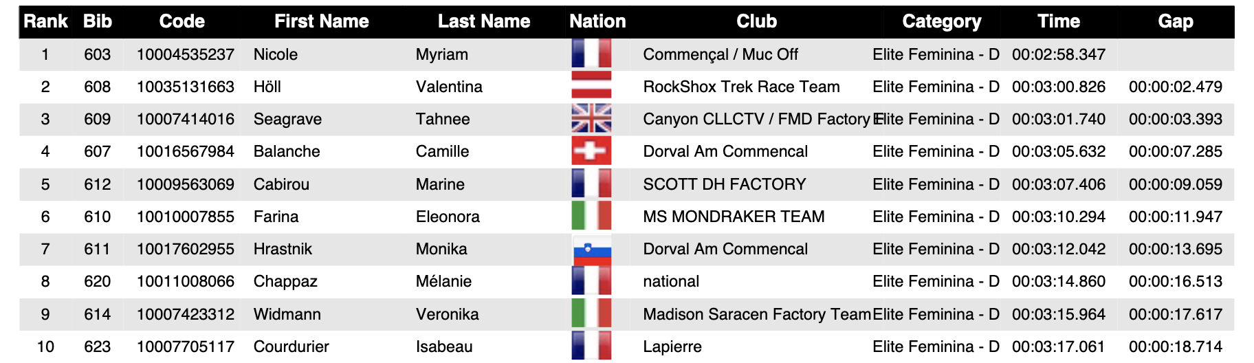 En Elites Femmes, la Française devance Vali Höll, sa principale rivale de 2021, et Tahnée Seagrave. Camille Balanche prend la 4e place, juste devant Marine Cabirou. On notera également la 10e place d’Isabeau Courdurier, venue faire une pige en DH pour travailler sa vitesse et qui se classe derrière quelques espoirs de la discipline comme les Britanniques Phoebe Gale et Mikayla Parton. Belle performance également de Vicky Clavel (VVRacing Academy), 14e pour sa première course chez les Elites.