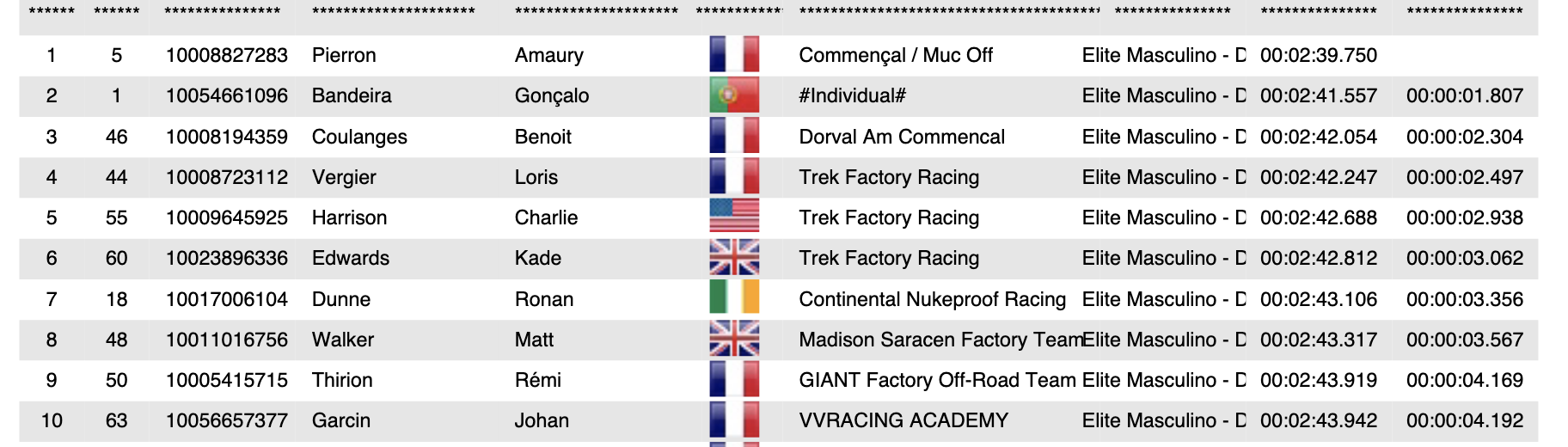 En Elites Hommes, les Français n’ont pas laissé grand-chose aux autres pilotes. Derrière Amaury Pierron, on trouve le Portugais Gonçalo Bandeira, surprise du jour puis Benoît Coulanges qui se glisse pour moins de 0,2 secondes devant Loris Vergier. Charlie Harrison clôt le top 5 et à peine plus loin dans le classement, Rémi Thirion mène un joli tir groupé : il est 9e, suivi par Johan Garcin (VVRacing Academy), Baptiste Pierron et Thomas Estaque. Loïc Bruni ne se classe que 16e, mais il semble avoir été victime d’un petit incident mécanique pendant son run. Venu faire un tour sur le vélo de DH comme sa coéquipière du Lapierre Zipp Collective, Adrien Dailly prend la 21e place.