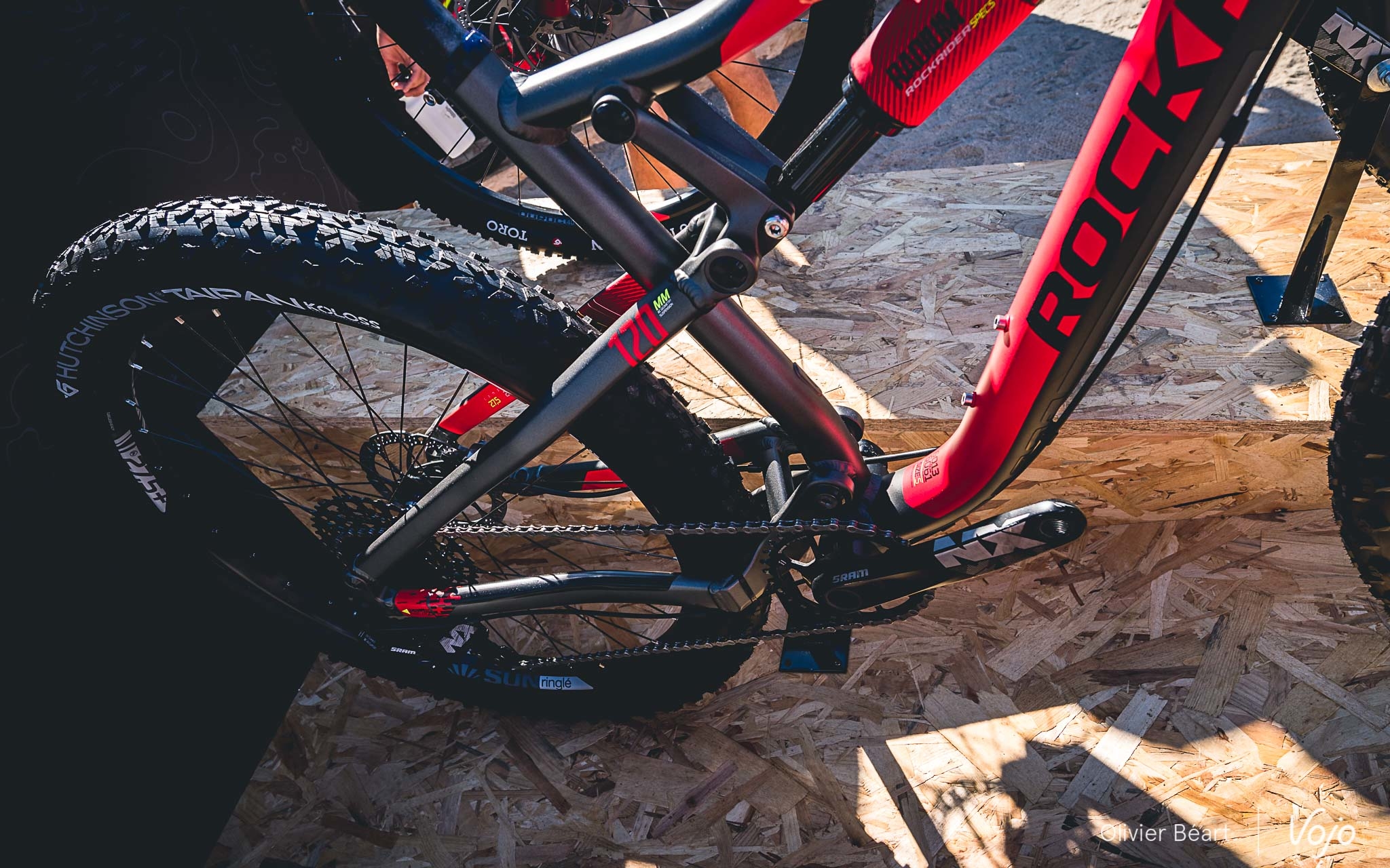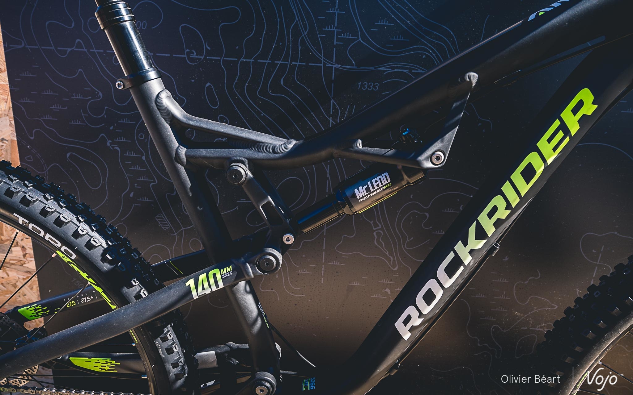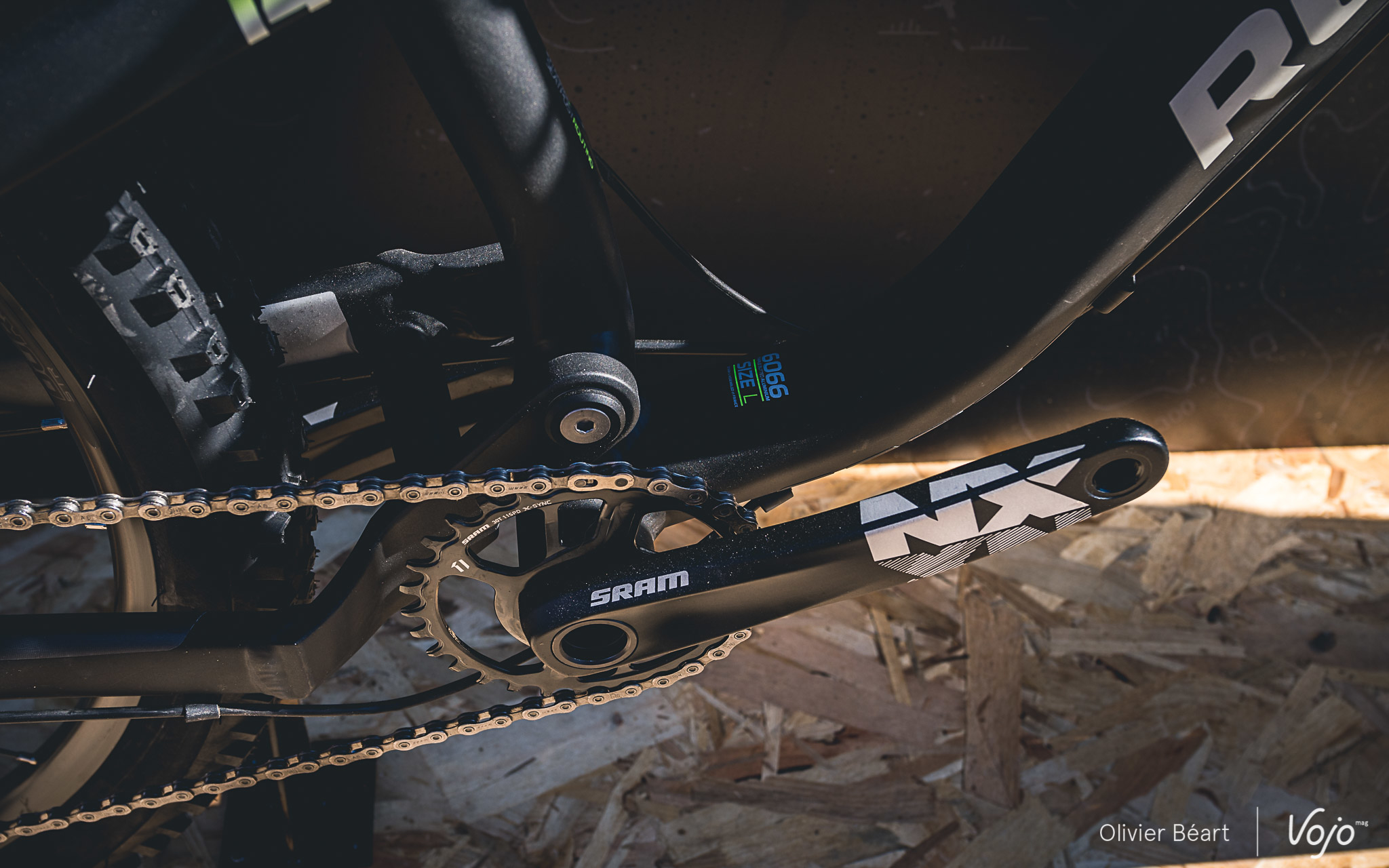 Comme sur le Rockrider XC 100 S, on note la disparition du système NEUF, au profit d’un système plus classique de type monopivot avec biellette. L’objectif est d’améliorer la fiabilité et la simplicité, avec notamment des roulements standards disponibles très facilement ; et le passage au mono-plateau a permis d’optimiser l’anti-squat avec un point de pivot placé pile au niveau du sommet des dents avec un plateau de 32 dents.