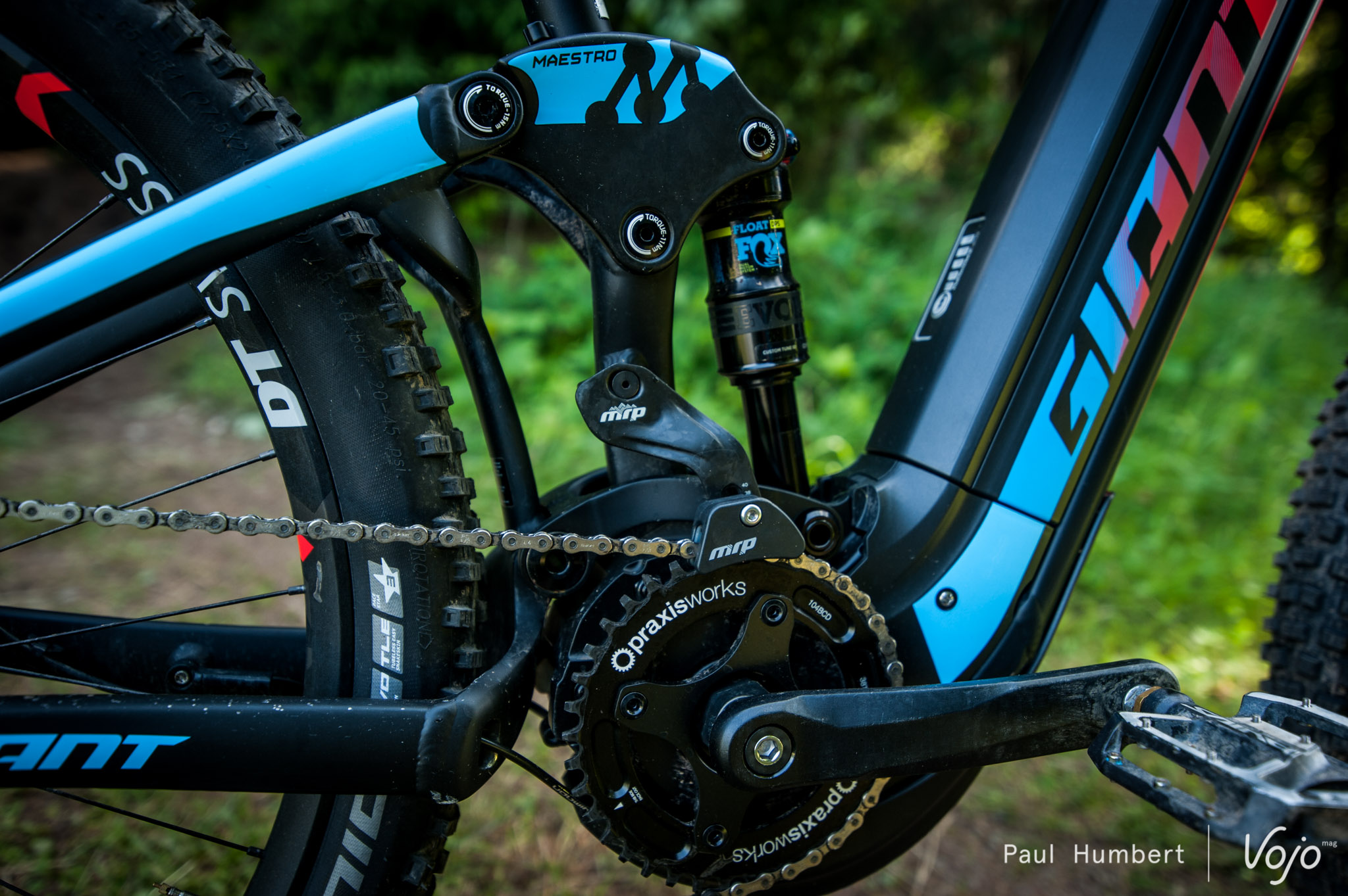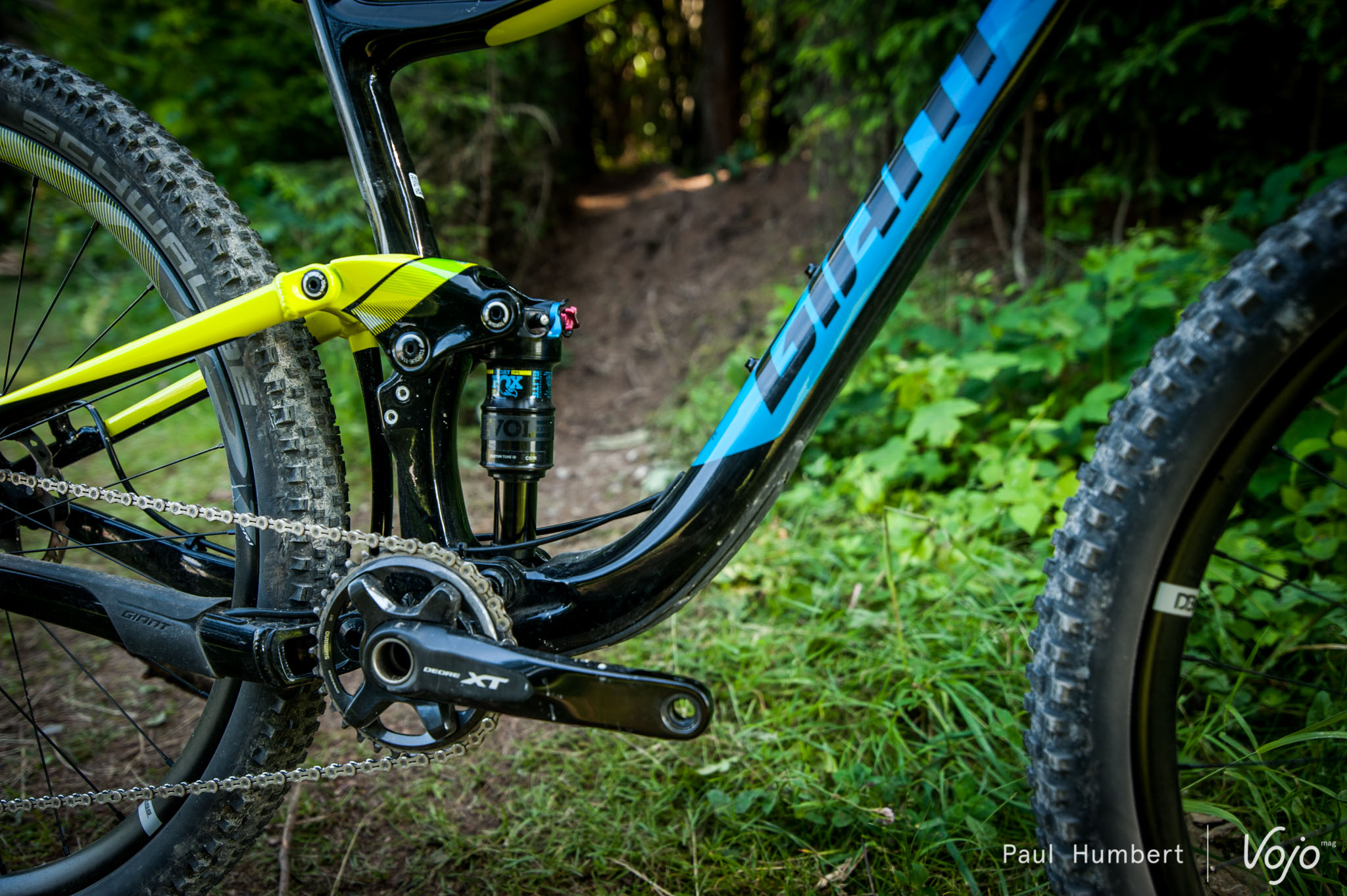 L’Anthem s’équipe, dans ses versions haut de gamme, d’un triangle avant et d’une nouvelle biellette en carbone tout en conservant un triangle arrière en aluminium. Présenté dans sa version 27,5 pouces, une version 29 pouces devrait voir le jour… et c’est une petite révolution puisque la marque avait dit adieu à ce format de roues il y a quelques années, ce que nous regrettions franchement car Giant était à nos yeux un des meilleurs spécialiste des grandes roues.