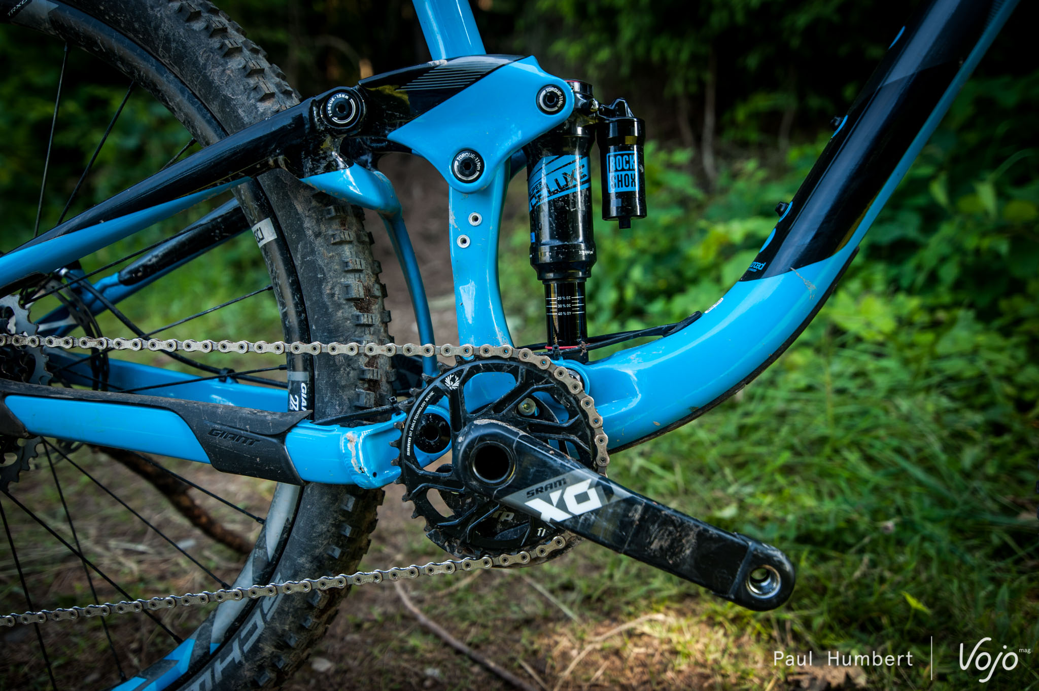 Jusqu’à présent très orienté marathon, voire XC à l’ancienne (voire notre prise en mains de la version 2016 dans cet article) le vélo se veut désormais encore plus polyvalent. Comme le Trance, le triangle avant du Giant Anthem 2017 s’allonge d’1cm tout en s’équipant de bases plus courtes et d’un boitier de pédalier plus bas. L’angle de direction s’ouvre d’un demi degré mais le débattement arrière reste de 110mm.