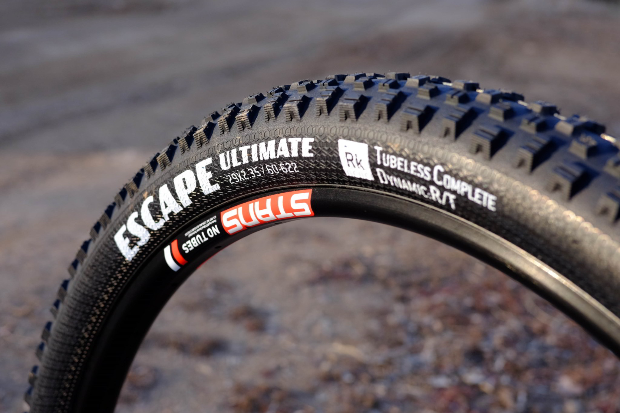 Le Escape est lui aussi disponible en 27.5″ et 29″, en sections de 2.35″ ou 2.6″ dans les deux diamètres. Nous retrouvons les carcasses Premium et Ultimate, ainsi que le renfort EN (Enduro) 1,5 pli pour ceux qui en auront une utilisation musclée. En plus de la gomme Dynamic A/T, la Dynamic R/T (Rugged-Terrain) est proposée sur les versions Enduro pour améliorer le grip.