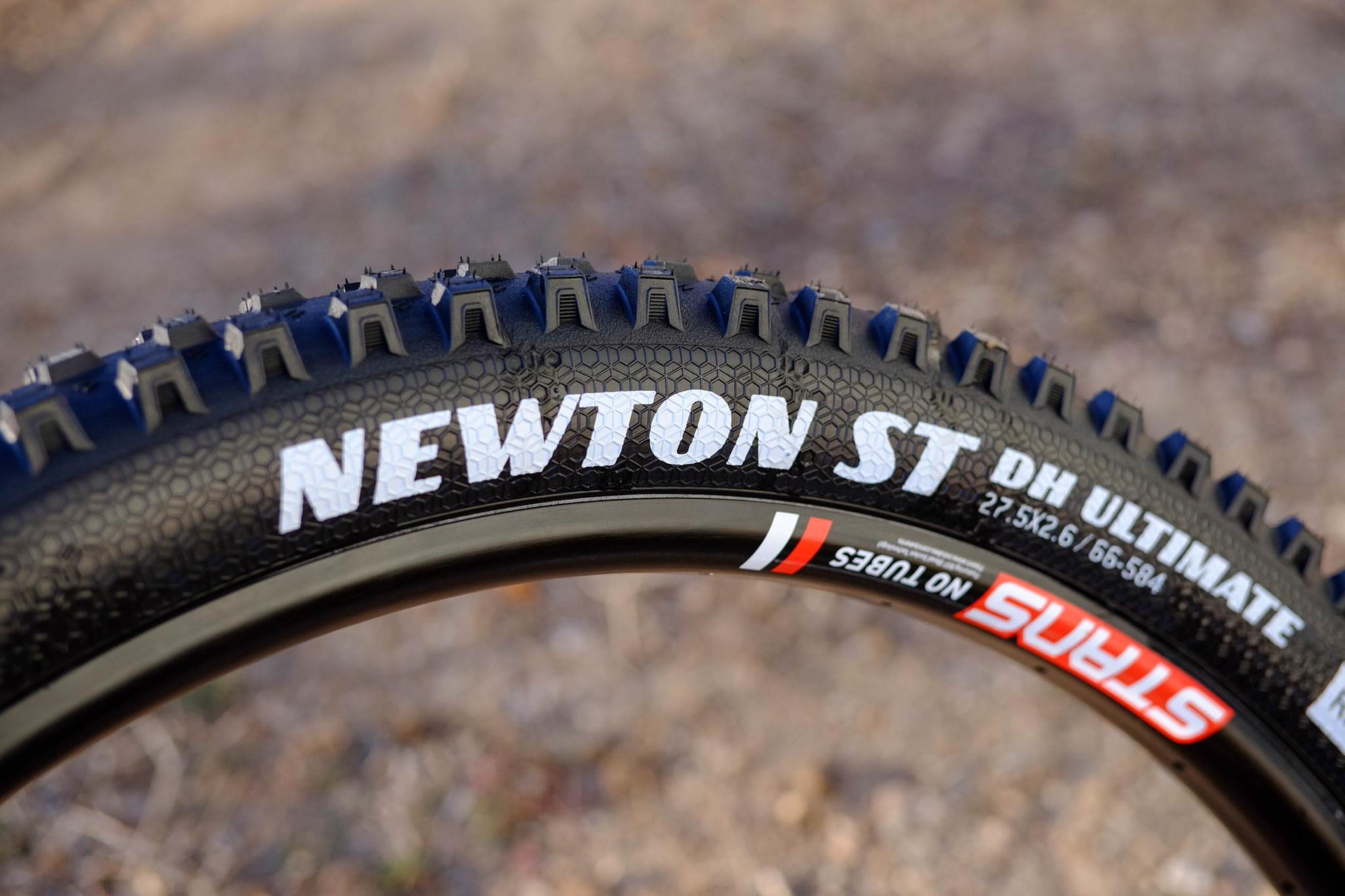 Nous montons encore d’un cran vers les pratiques « Gravity » avec le bien nommé Goodyear Newton et ses crampons généreux. Les pratiques visées sont l’enduro et la DH. Disponible en sections de 2.4″ et 2.6″ en 27.5″ comme en 29″, le Newton ajoute encore des possibilités de gommes et de carcasses par rapport à l’Escape… Le renfort DH (2 plis), en complément à l’enveloppe Ultimate, améliore la rigidité des flancs et la longévité des pneus.