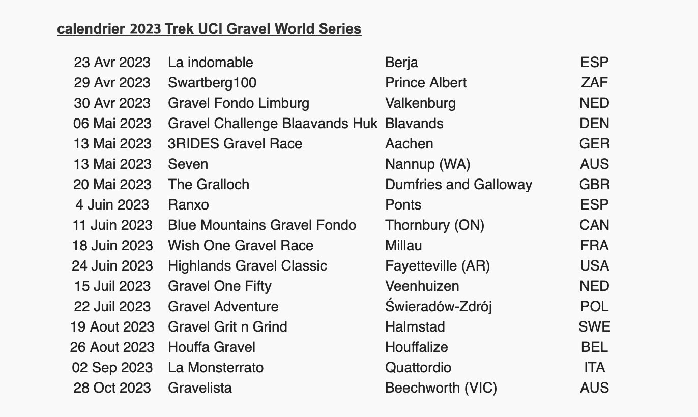 Dans ce calendrier 2023, on retrouve 10 des 12 manches organisées la saison dernière. Si l’on doit dire au revoir à la manche aux Philippines ainsi qu’à celle d’Amana aux USA, ce sont toutefois 7 nouvelles épreuves qui font leur apparition. Ces nouvelles manches permettent de mettre en avant à quel point chaque course possède son ADN avec son style particulier, tantôt tourné vers le cyclisme tantôt orienté gravel.
