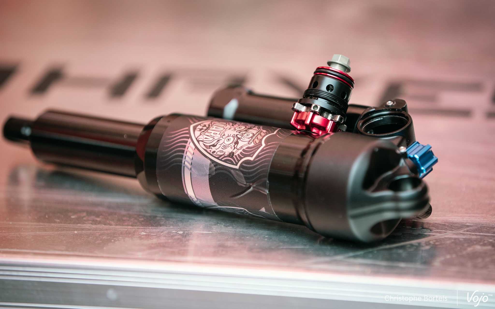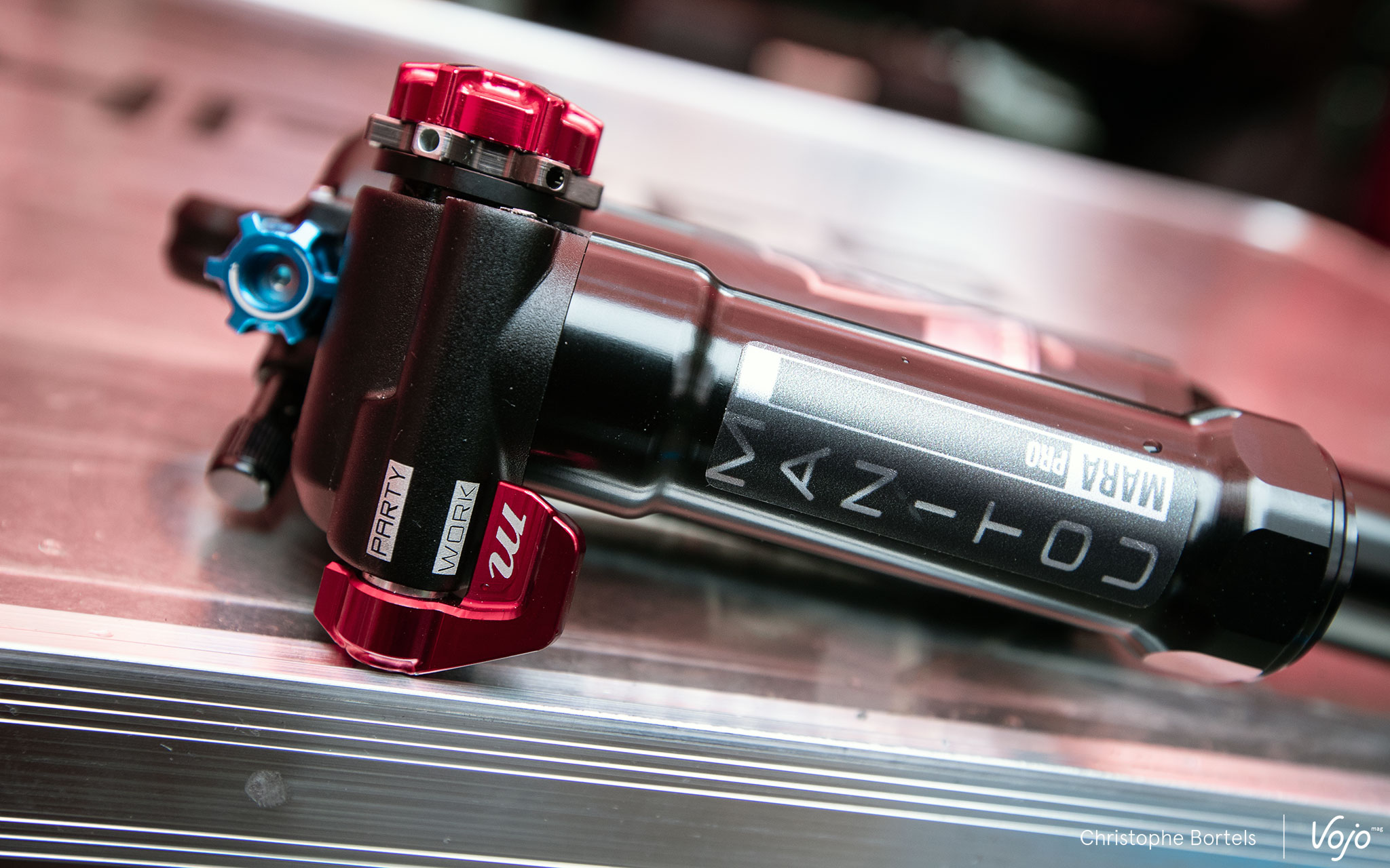 Pour Jon Swanson, il fallait un amortisseur à air à la hauteur pour compléter la nouvelle fourche. Voici donc le Mara Pro ! On y retrouve les mêmes réglages de base que la nouvelle fourche, à savoir le rebond basse vitesse et les compressions hautes et basses vitesses. Trois tailles de chambre d’air différentes seront proposées (c’est la plus plus petite qui est visible sur les photos de cet article) ainsi que trois longueurs de piggy back (le réservoir), pour s’adapter au mieux aux cinématiques, aux pratiques et aux préférences du pilote. Un nouveau piston IFP développé conjointement avec SKF offre une certaine souplesse en son centre, ce qui permet de gagner en sensibilité sur les petits chocs, le piston se déformant avant même de commencer à bouger.
