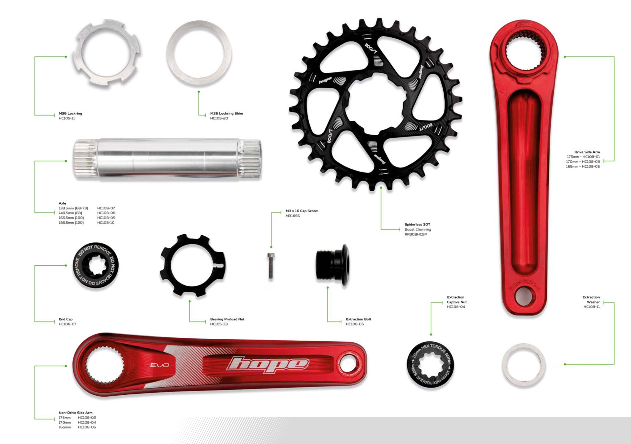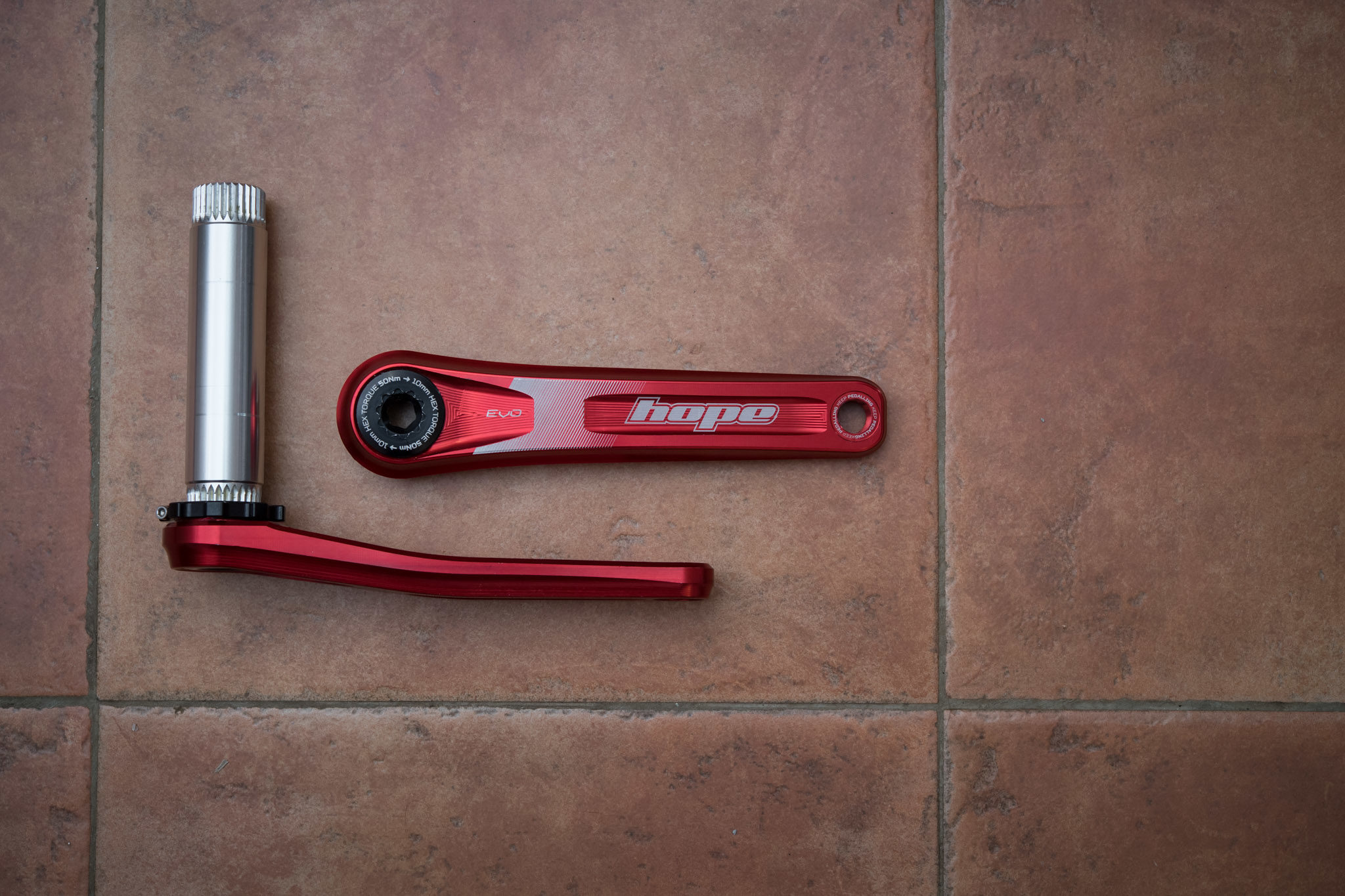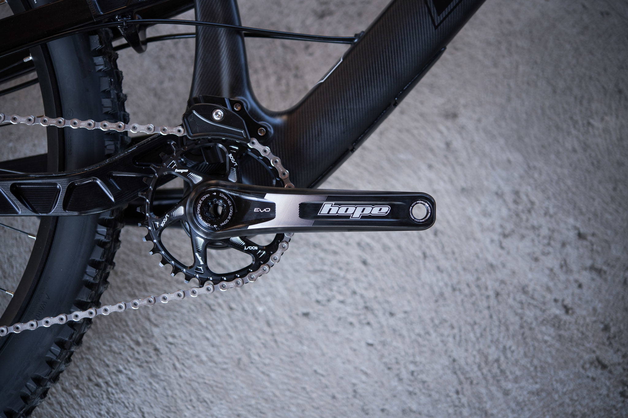 Pour 2019, Hope améliore un autre produit déjà existant en gamme et produit dans les bâtiments de l’entreprise : son pédalier. Baptisé EVO, il est toujours usiné en CNC dans un aluminium 7150 et disponible en manivelles de 165, 170 et 175mm. La nouveauté concerne principalement son poids, qui diminue, sa rigidité, qui augmente et son interface de fixation qui se dote d’un auto-extracteur.