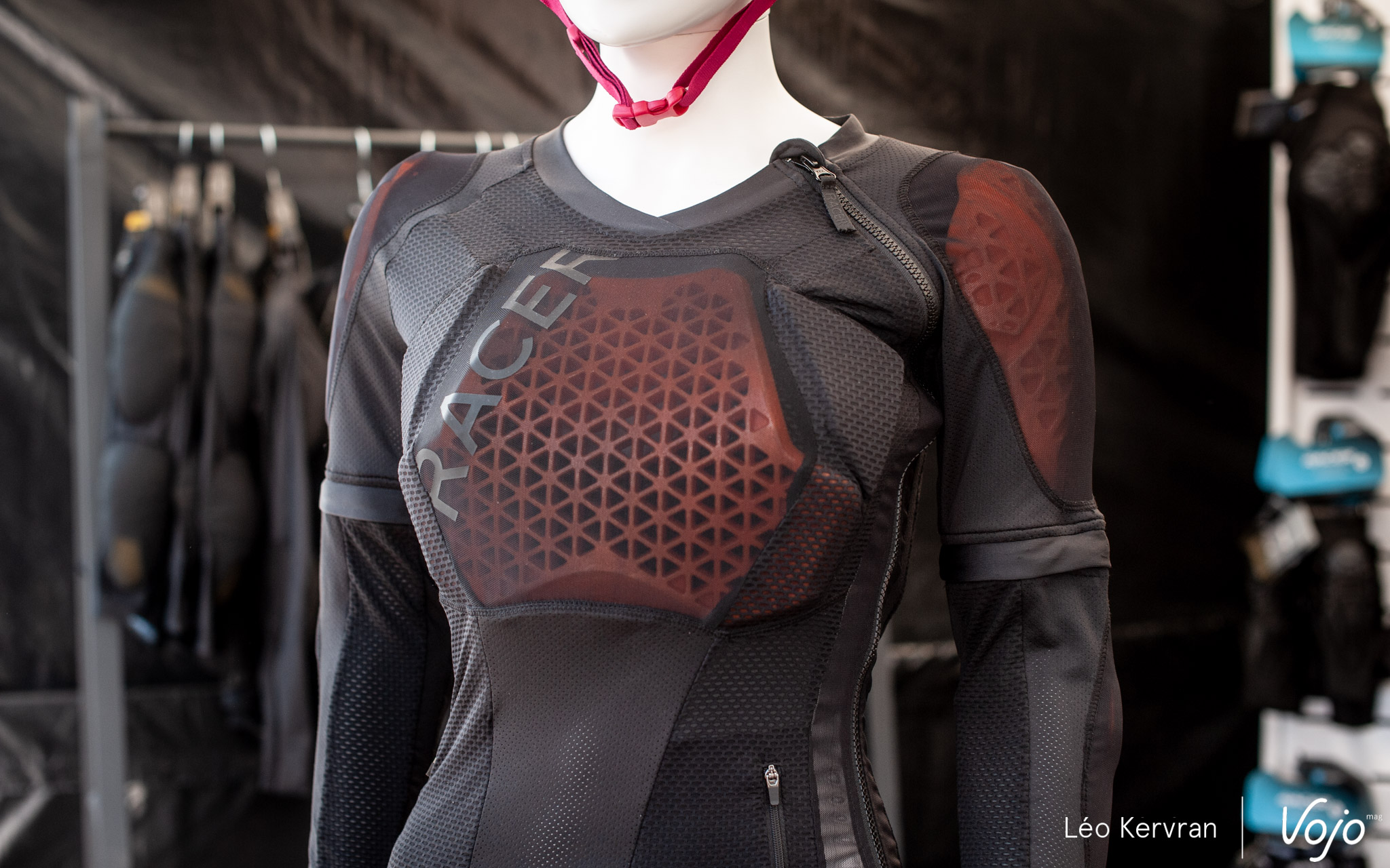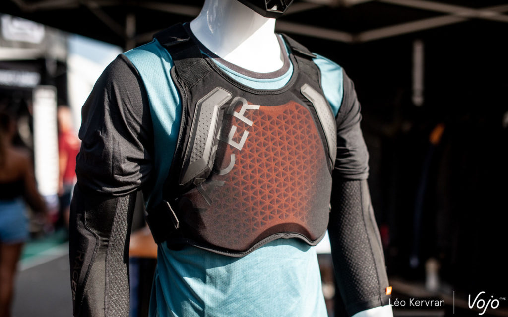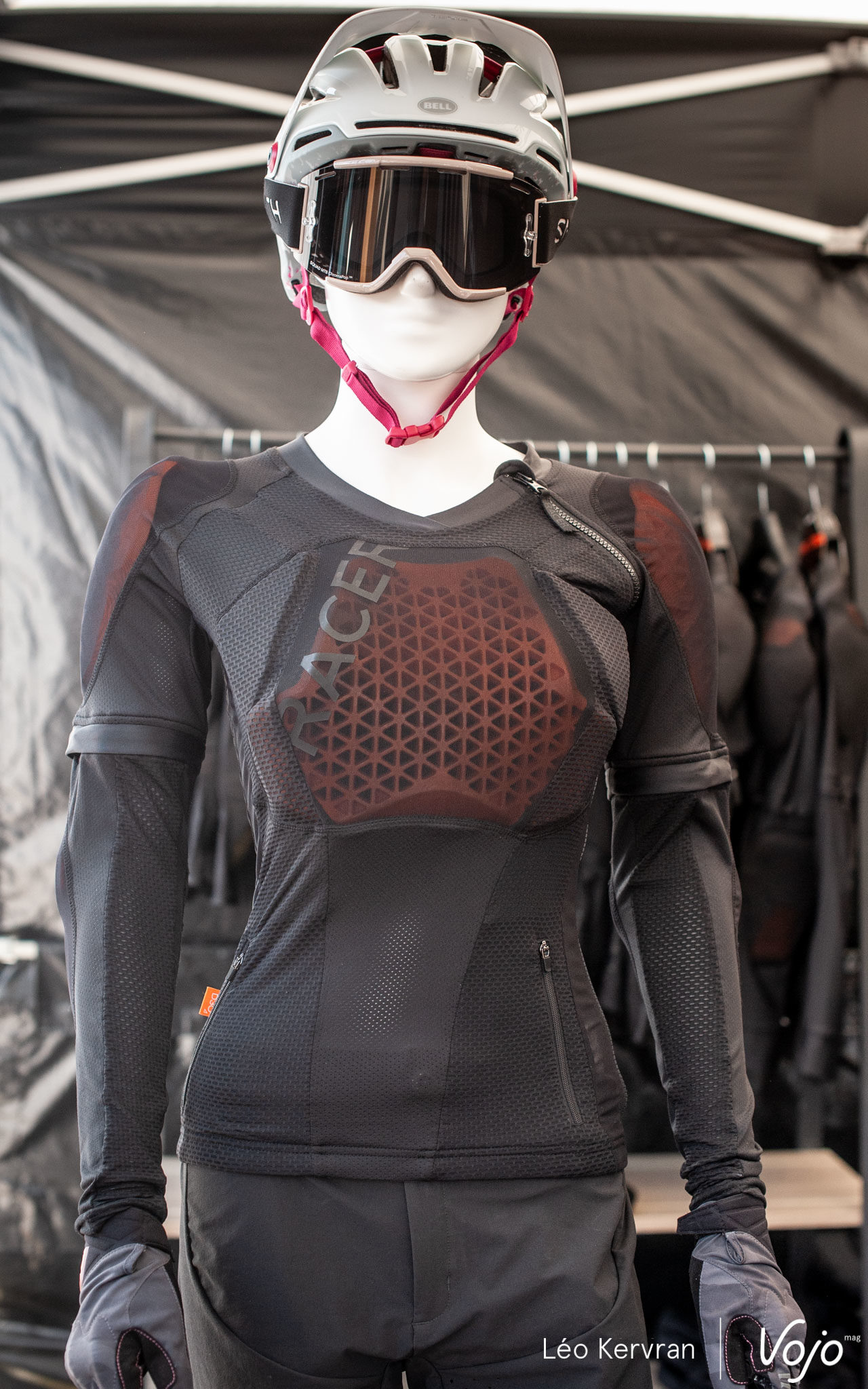 Sur l’autre mannequin, on découvrait un ensemble dorsale-plastron baptisé Alpha, un élément de protection très en vogue aujourd’hui chez elles et ceux qui souhaitent plus de confort qu’avec un gilet complet sans négliger la protection des parties les plus importantes. Ajustable via 4 scratchs sur les épaules et les flancs, il sera affiché à 189,95 €.