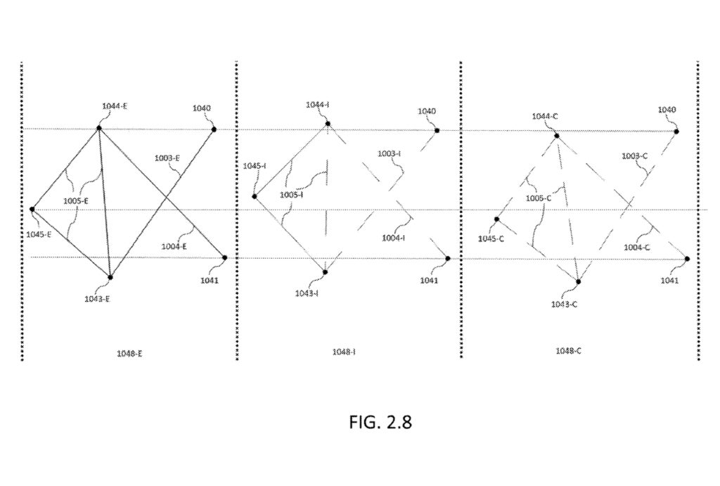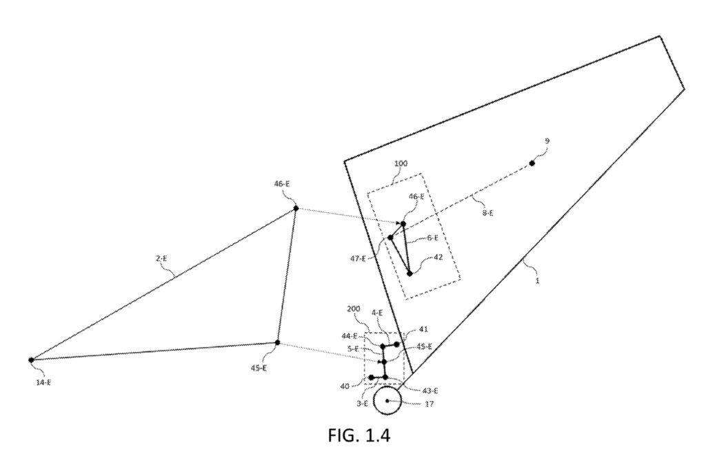 Désormais, le triangle arrière serait fixé par un pivot au centre d’une pièce en « S », reliée elle-même au triangle arrière (en bas) et avant (en haut) par deux lames capables de se déformer ou des liens fixes et des pivots pour accompagner le mouvement du triangle arrière comme le faisaient les plongeurs du Switch Infinity.