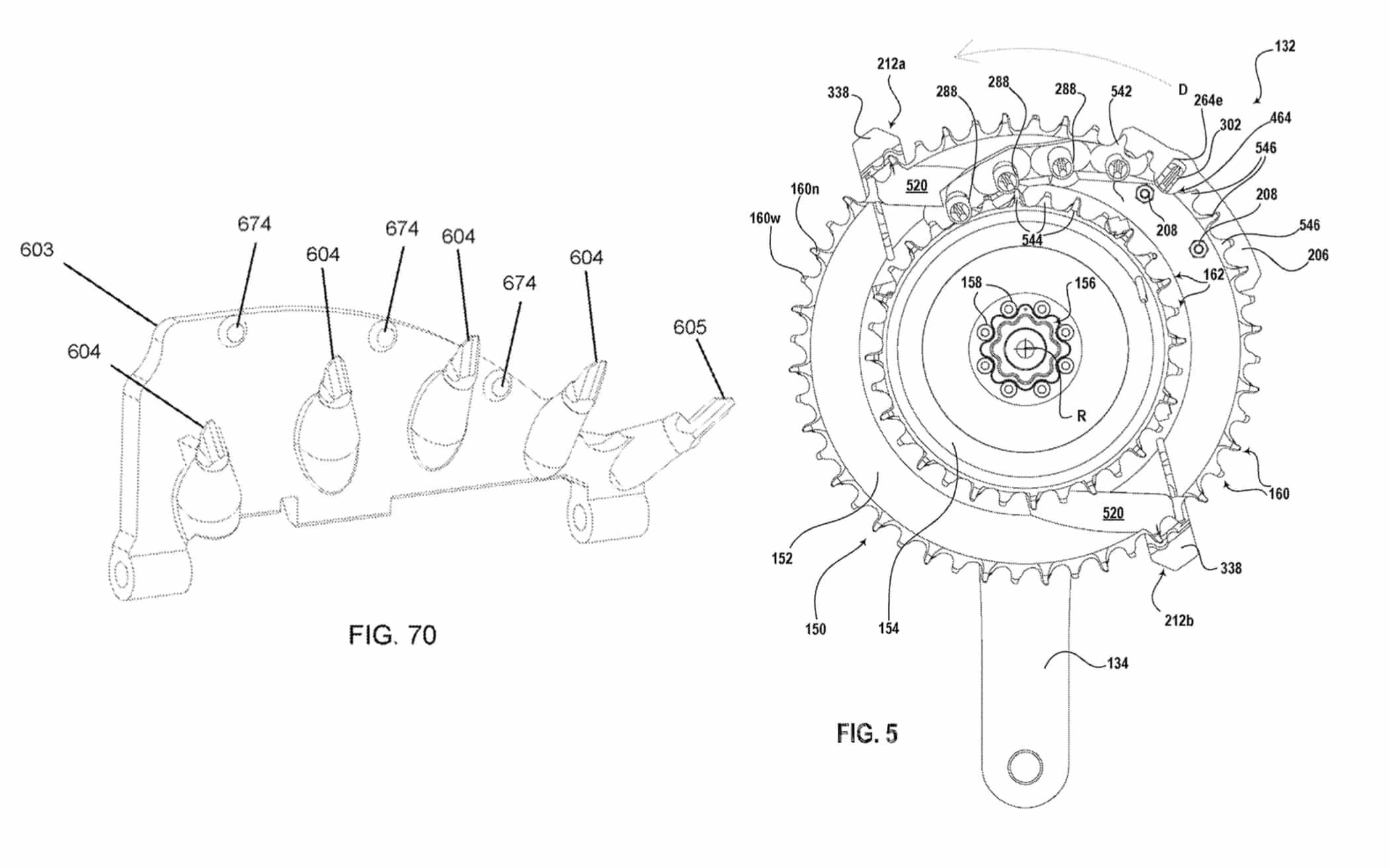 Les choses s’avèrent plus complexes pour le passage du petit au grand plateau. Le système utilise une série de « guides » (illustration de gauche sur le schéma ci-dessus) positionné entre les deux plateaux. Ceux-ci s’insèrent dans les creux entre chaque dent du petit plateau. Ainsi, le numéro 604 du schéma de gauche est le premier point de contact avec la chaine, la soulevant au fur et à mesure qu’elle est tirée jusqu’à ce que le numéro 605 guide la chaîne directement sur le grand plateau.