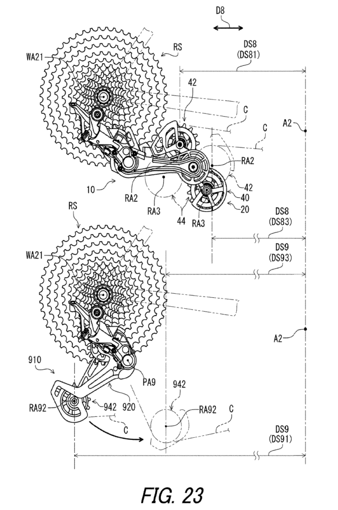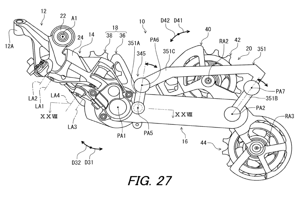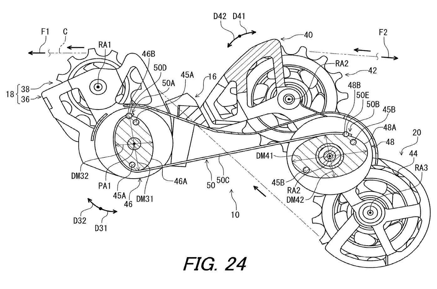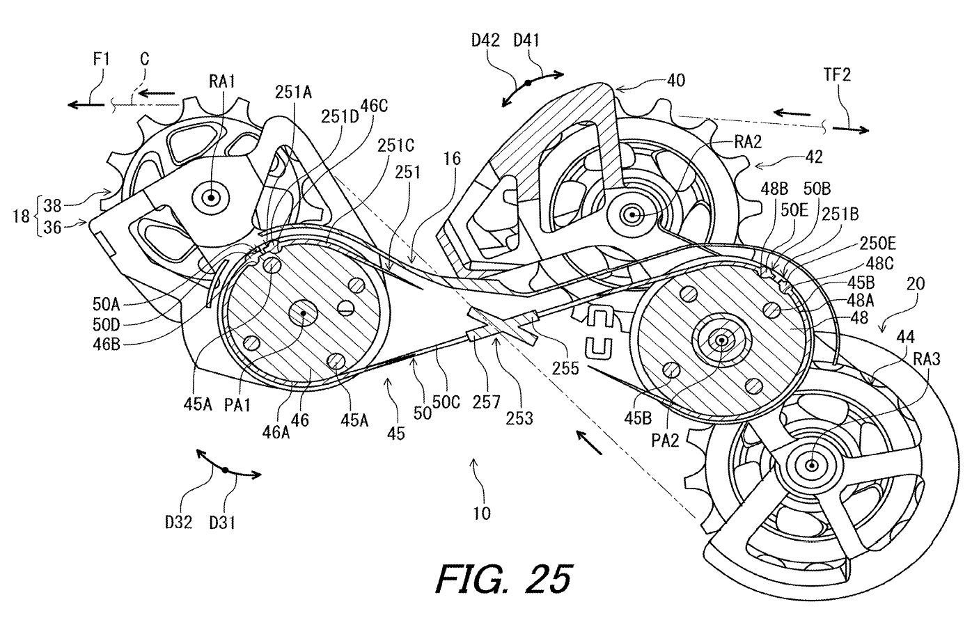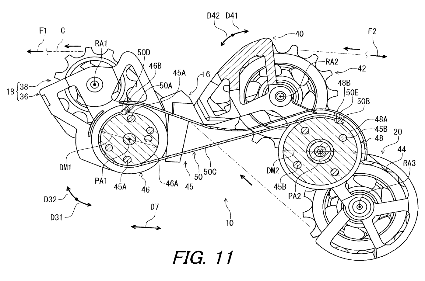 Shimano évoque aussi plusieurs variations pour le système de poulies notamment, avec des formes différentes, deux câbles… Le fabricant indique aussi qu’on pourrait se passer d’un des deux galets de tension pour simplifier l’ensemble mais si le brevet entier se concentre principalement sur un fonctionnement avec trois galets, on peut imaginer que ce serait moins performant.