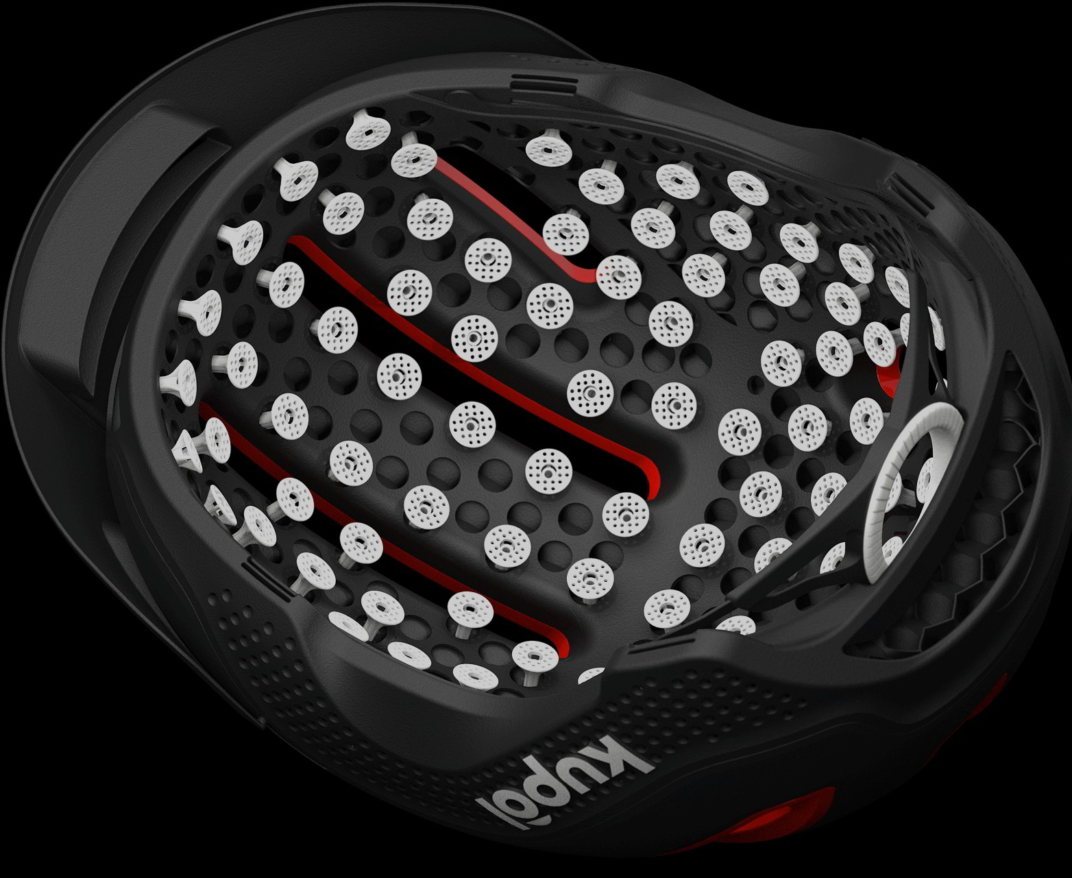 Kupol, au lieu du traditionnel bloc de polystyrène, a mis au point le « Kollide Safety System ». Ce procédé maison, breveté, utilise trois différents niveaux de protection. En première ligne, des coussinets ont pour mission d’absorber le choc. Ensuite, une deuxième couche structurelle reçoit le plus gros de l’impact en se déformant. Enfin, des sortes de petites ventouses flexibles (une centaine !) assurent le contact avec la tête du pilote.
